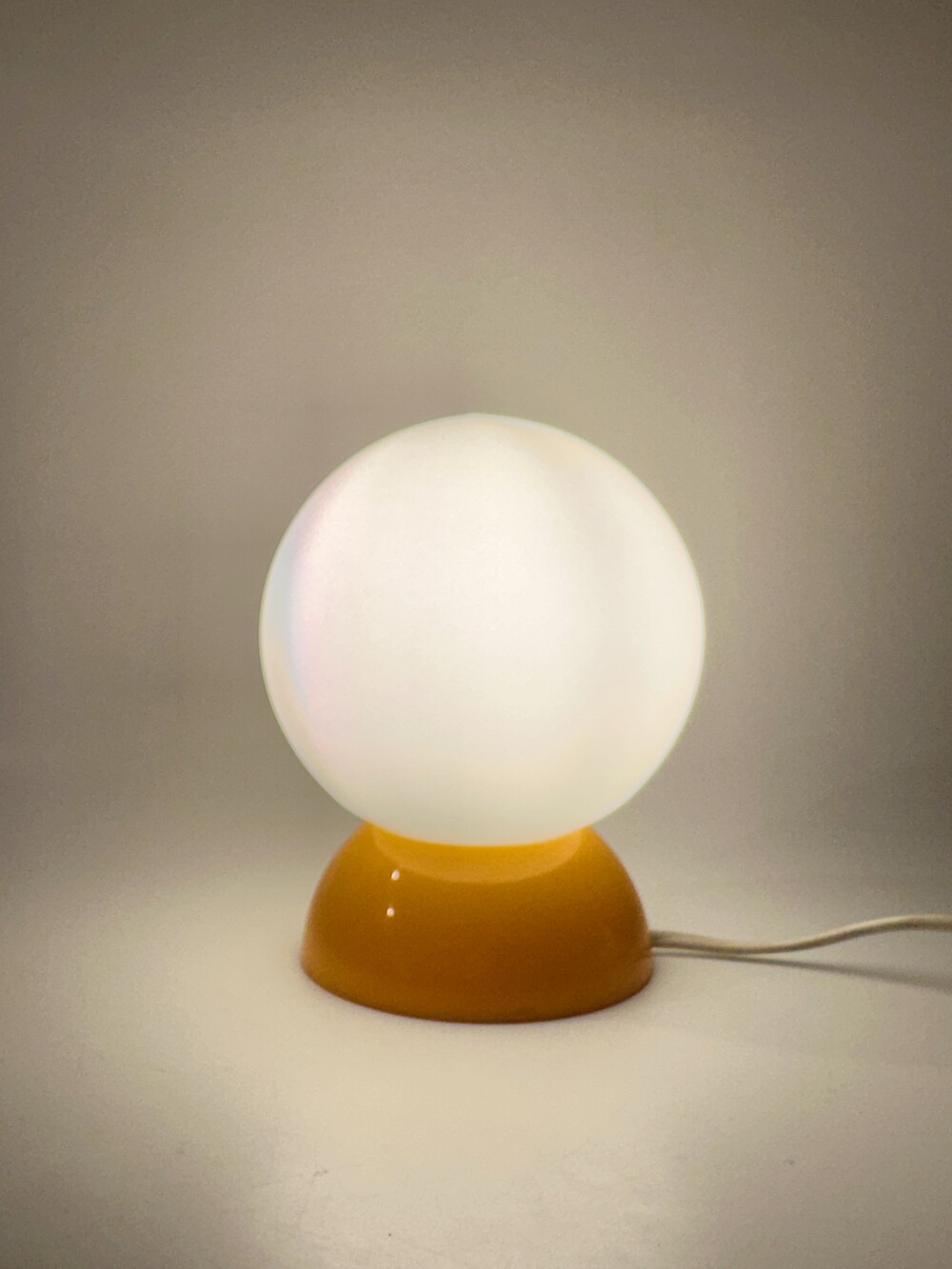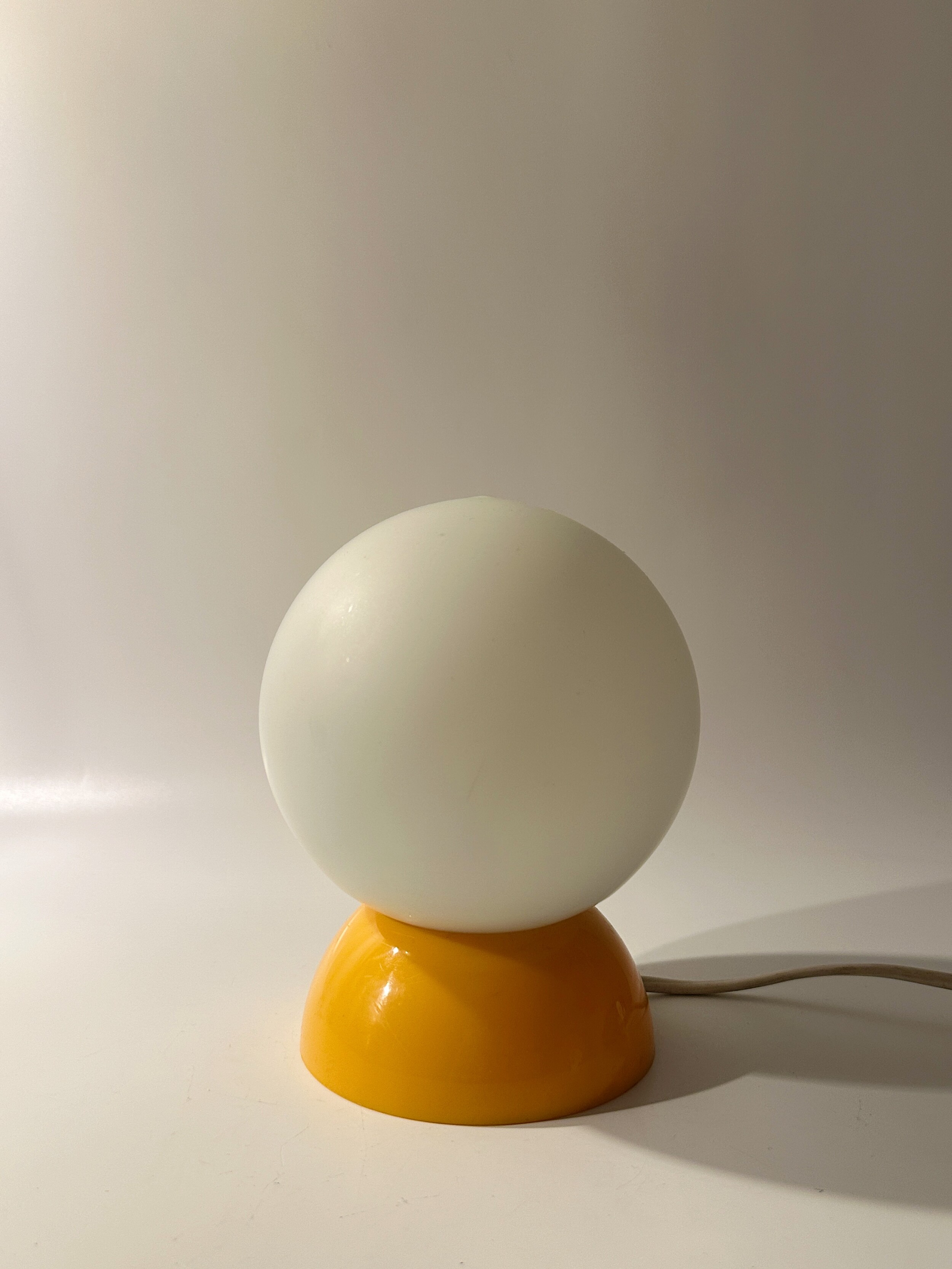 스페이스 에이지 감성이 느껴지는 귀여운 빈티지 테이블 조명이에요. 둥근 오팔 글라스 글로브와 선명한 머스터드 노랑 베이스의 대비가 인상적이에요.