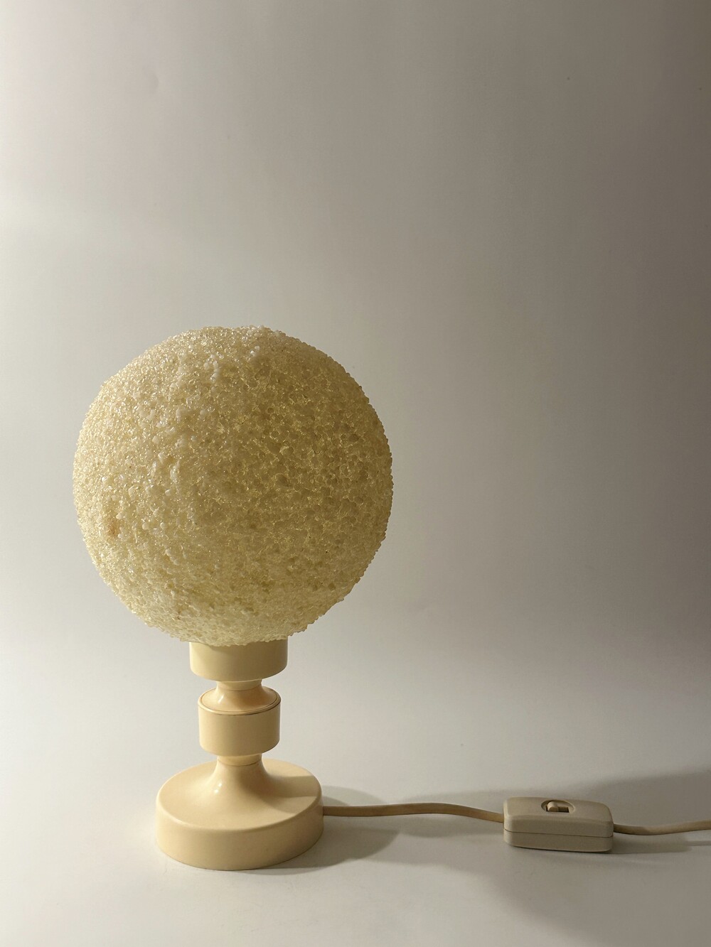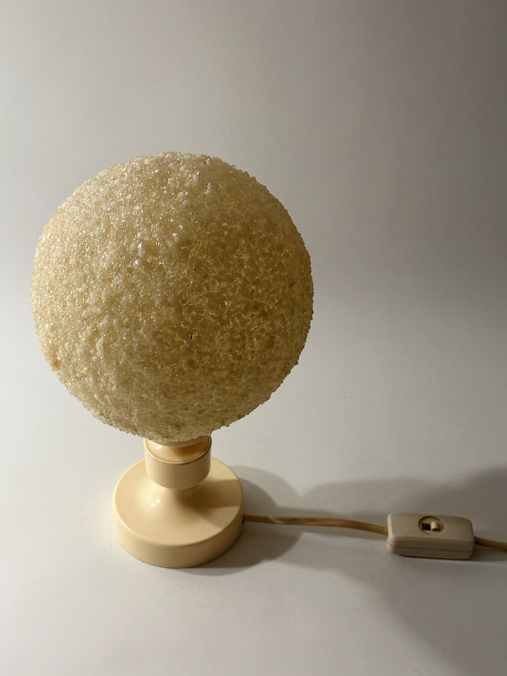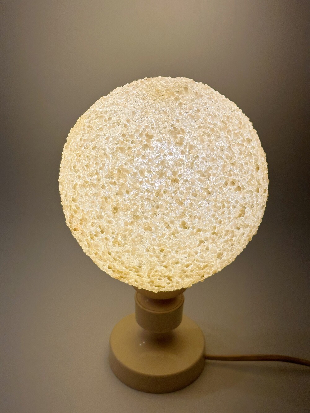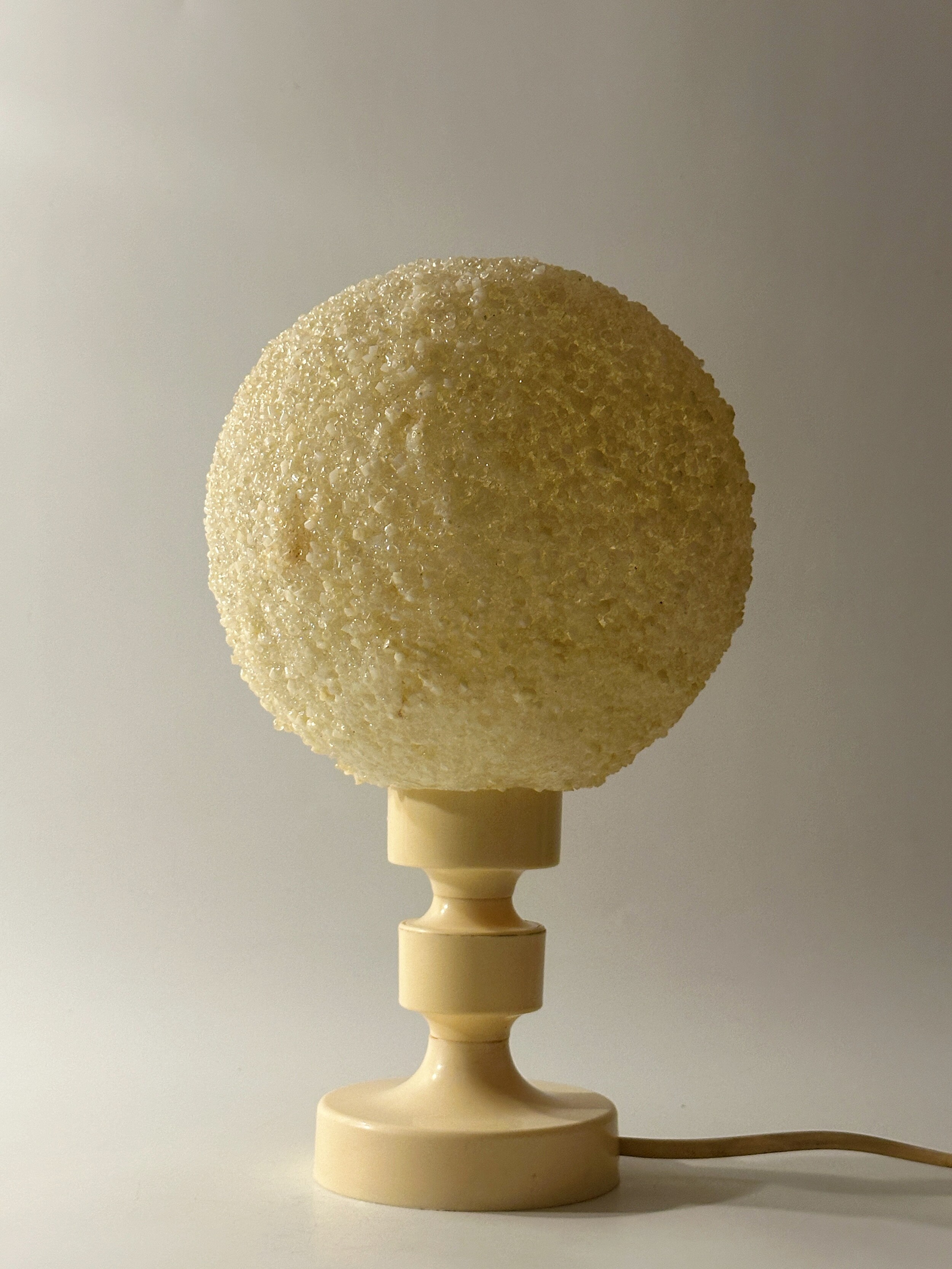 공기 방울들이 그대로 굳어버린 것처럼 기포 텍스처들이 인상적인 독일에서 넘어온 80년대 빈티지 조명이에요. 보통 일반적으로 글래스를 사용하는 것과 다른 질감의 빛 번짐을 만들어내요. 은은하고 따뜻하게. 헤드와 베이스의 톤은 동일하게 크리미한 컬러로 에이징이 되어 세월의 흔적을 그대로 느끼며 사용할 수 있습니다. 협탁 혹은 낮은 선반에 두면 조용하고 깊은 무드를 즐길 수 있을 것 같아요 ✨