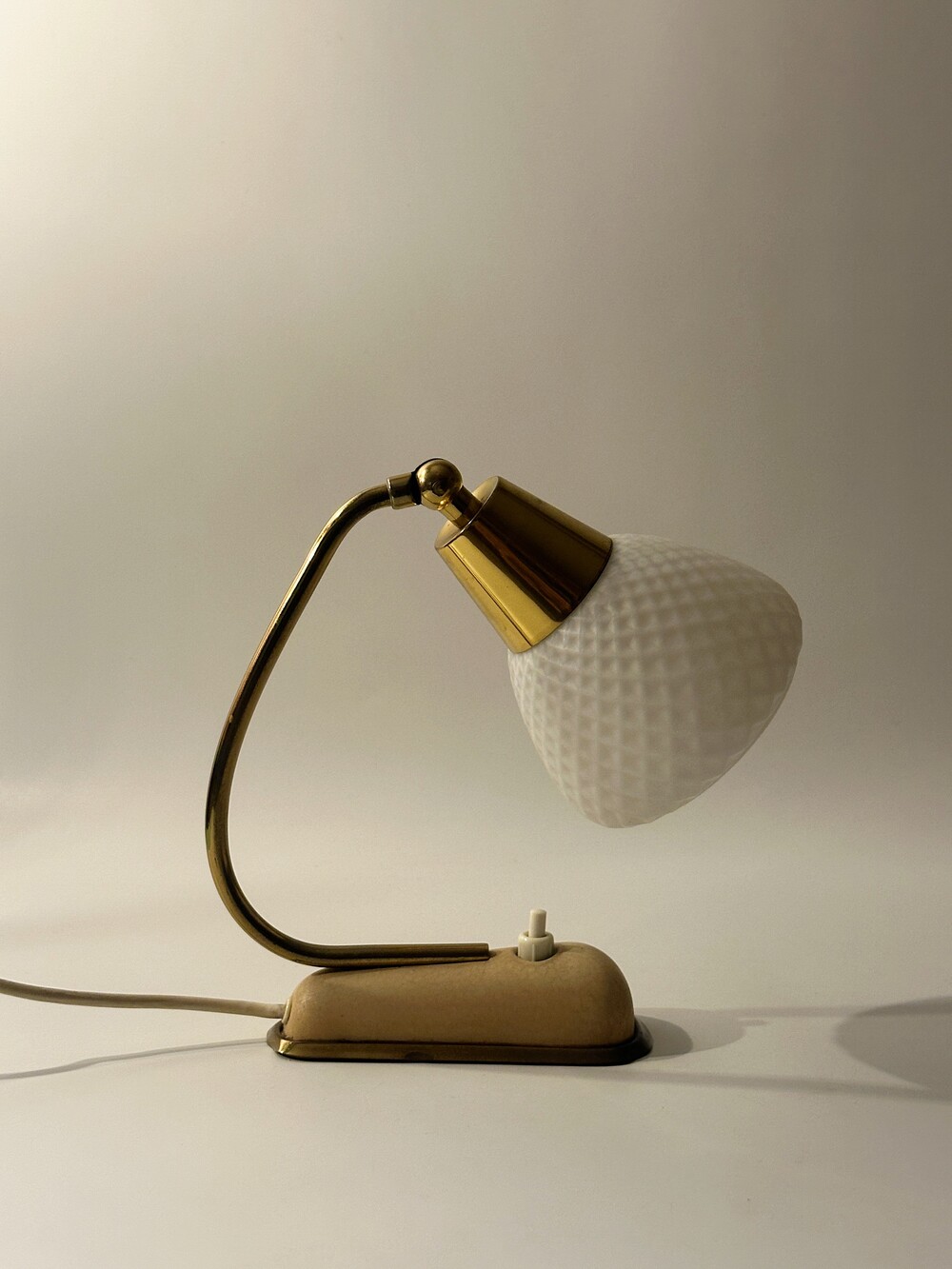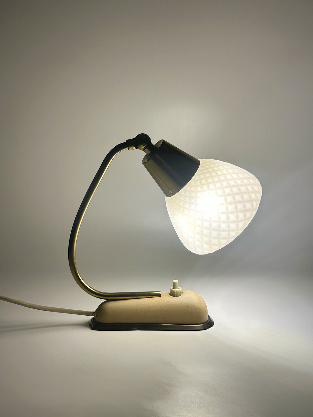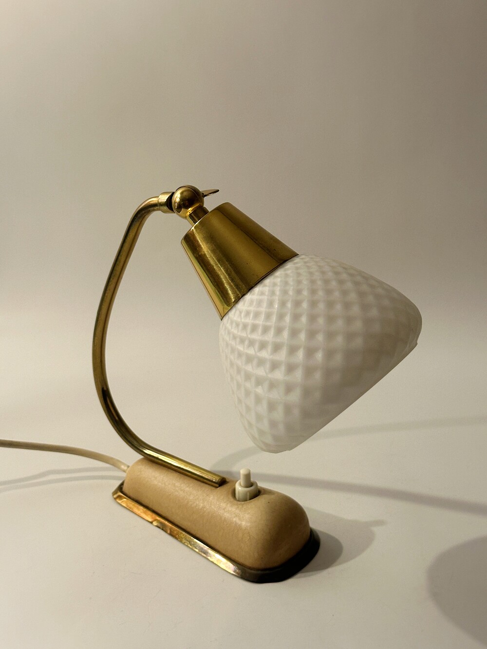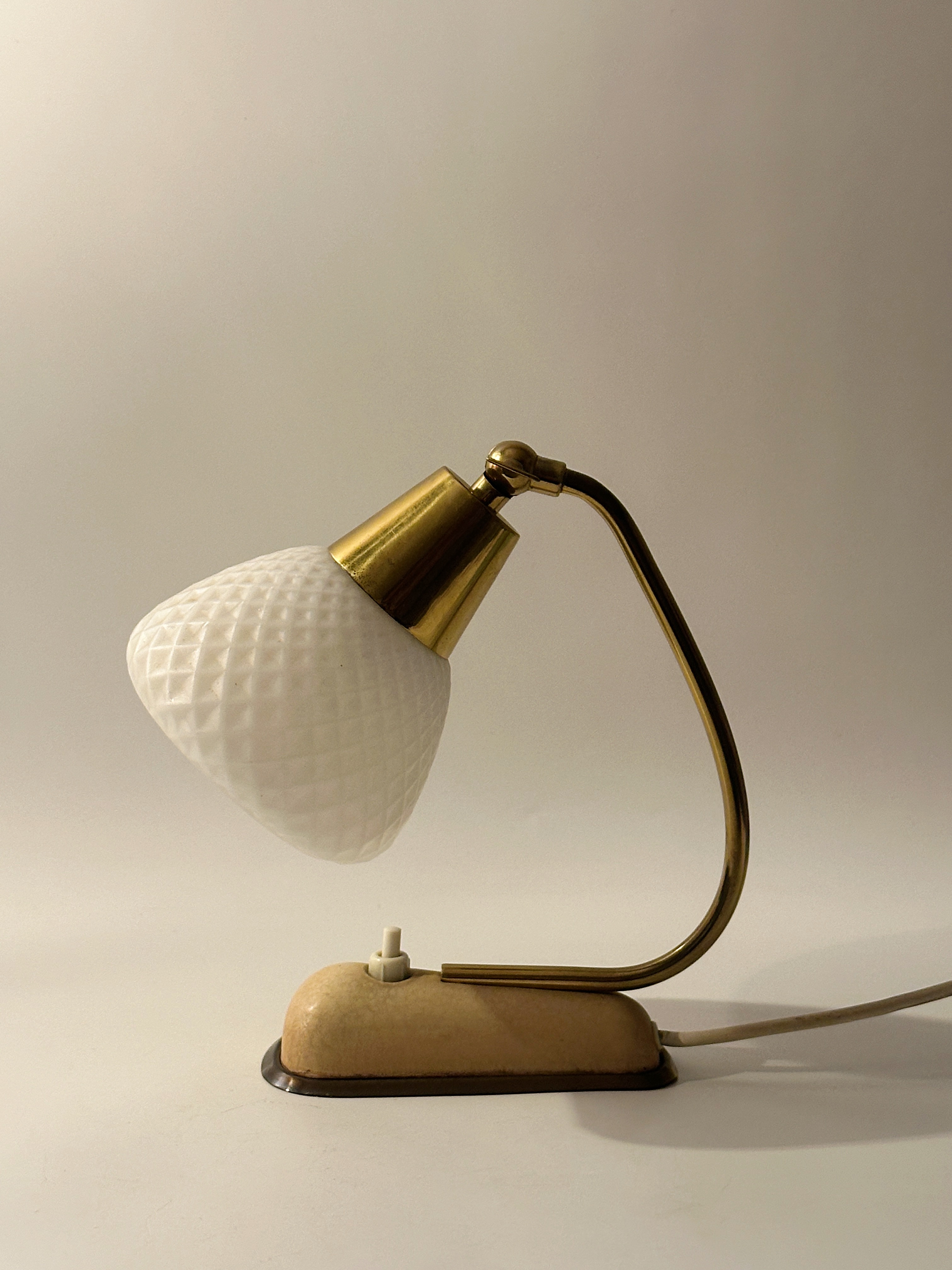 작고 정갈한 미드센츄리 모던 스타일의 70년대 독일 빈티지 조명이에요. 부드럽게 구부러진 브라스의 넥 부분과 그 끝에 달린 다이아몬드 패턴의 오팔 글래스 셰이드가 눈길을 끄는 베드사이드 조명이에요.