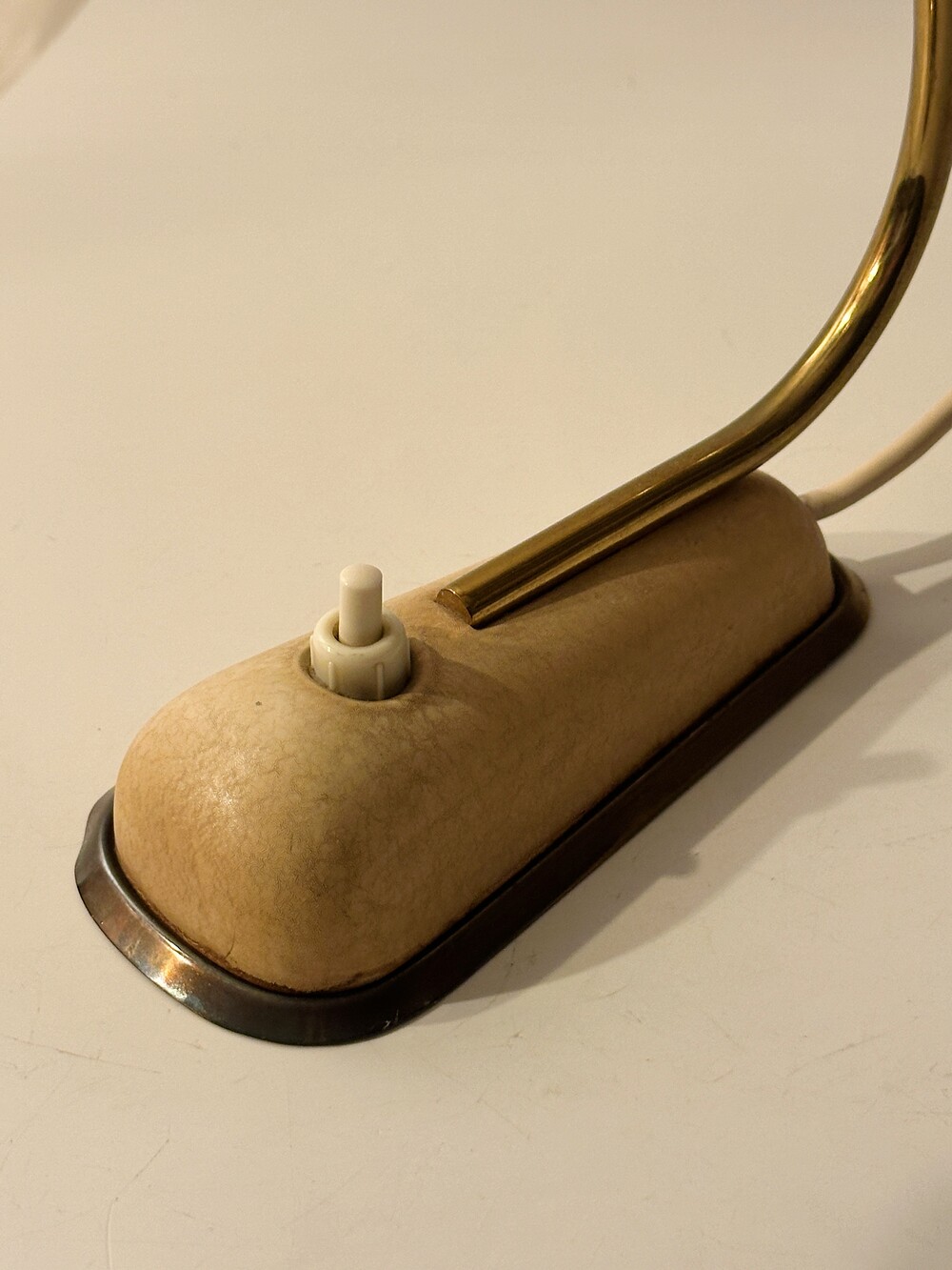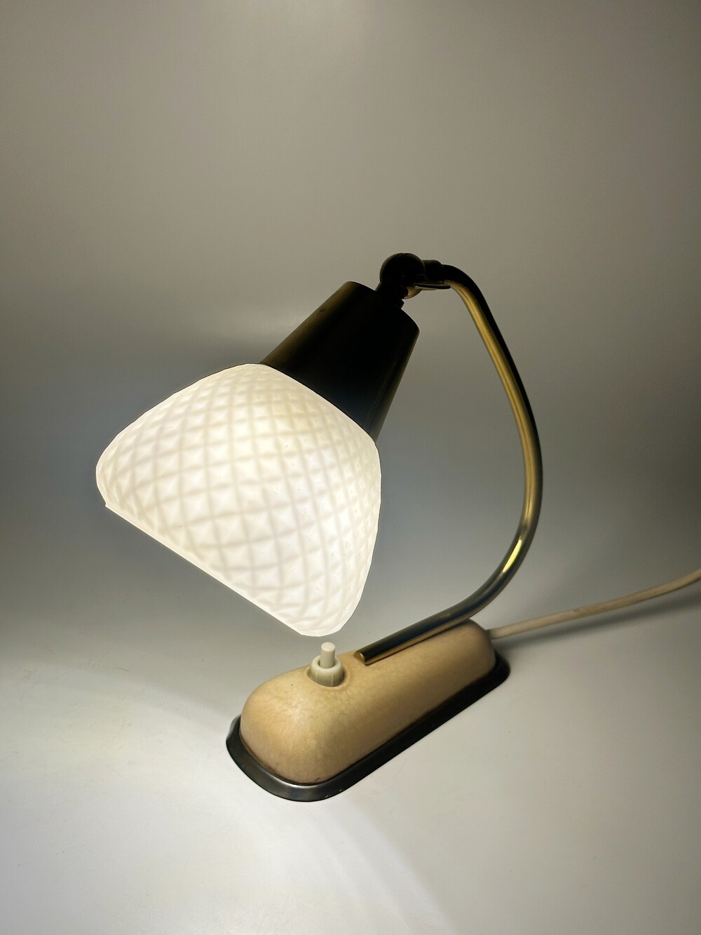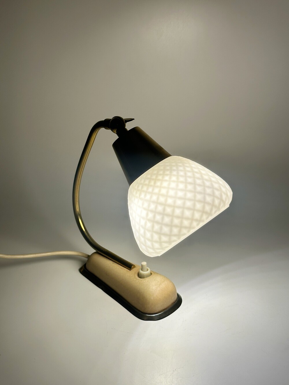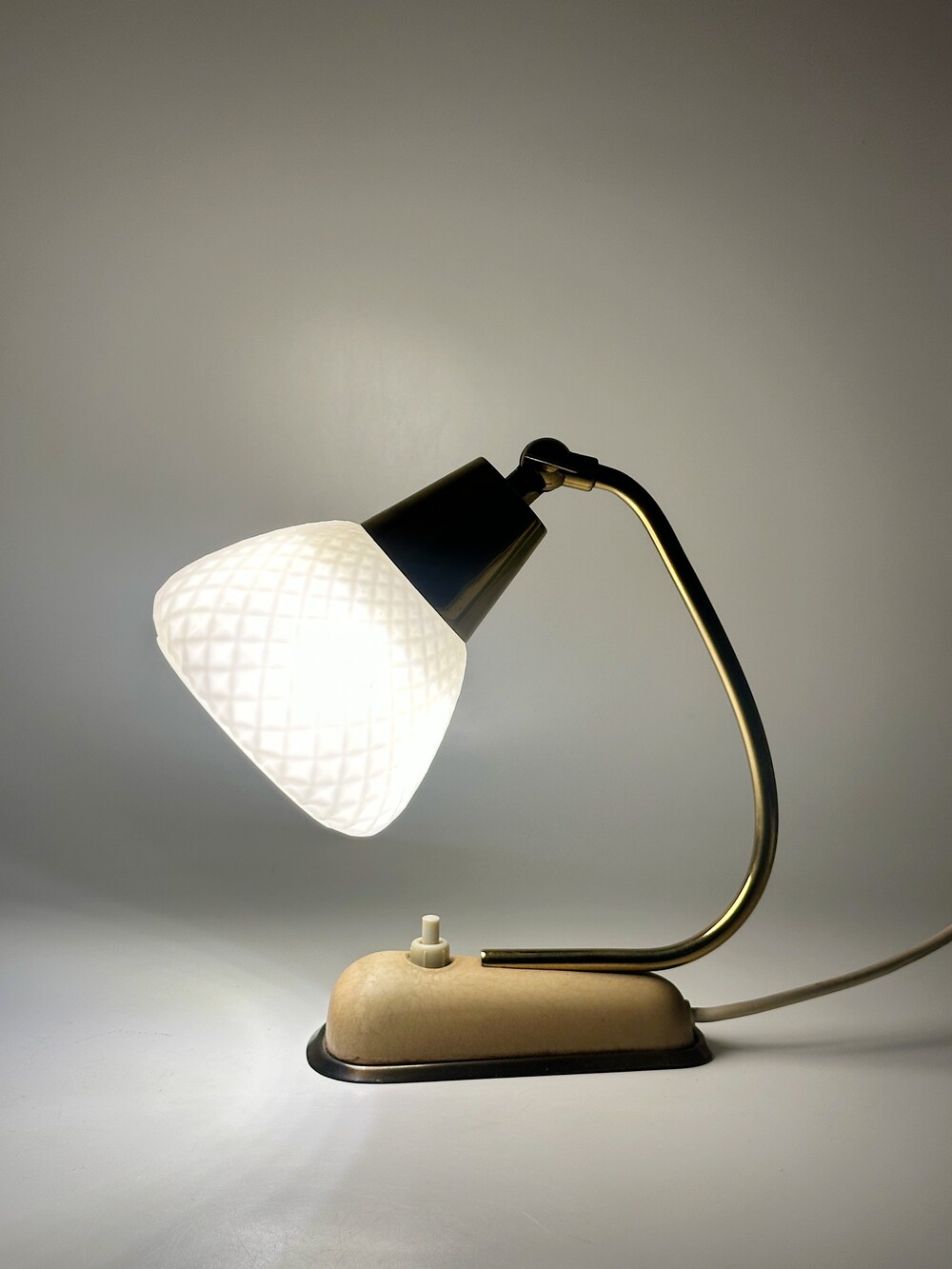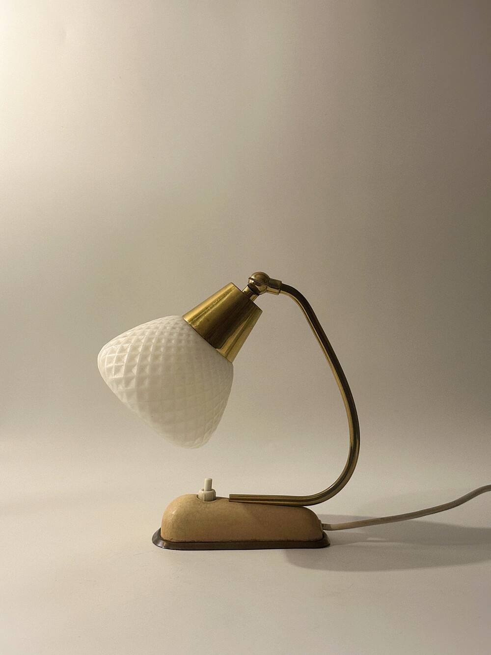 작고 정갈한 미드센츄리 모던 스타일의 70년대 독일 빈티지 조명이에요. 부드럽게 구부러진 브라스의 넥 부분과 그 끝에 달린 다이아몬드 패턴의 오팔 글래스 셰이드가 눈길을 끄는 베드사이드 조명이에요.