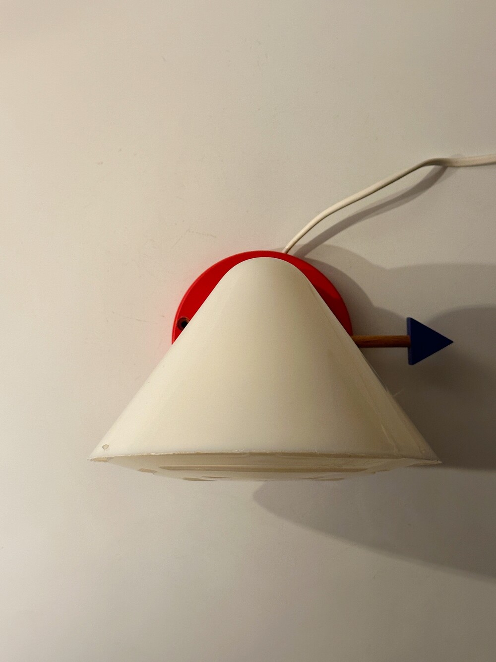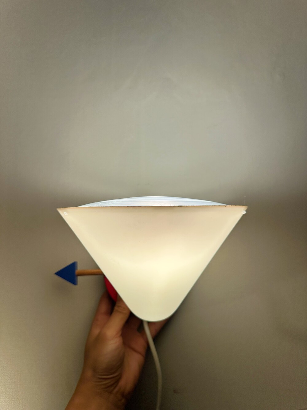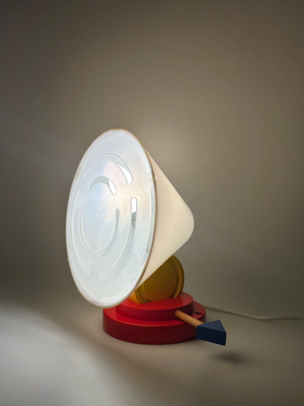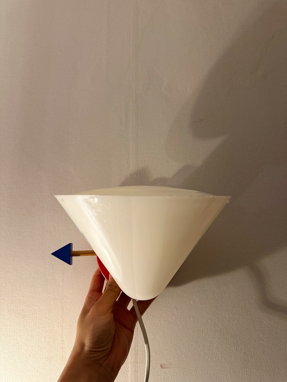붉은 원형 베이스 위로 뾰족하게 뻗은 흰색 원뿔 갓, 그리고 그 뒤를 받치는 파란 화살촉 모양의 손잡이, 마치 팝아트의 작품 같아요 ❤️🤍💙