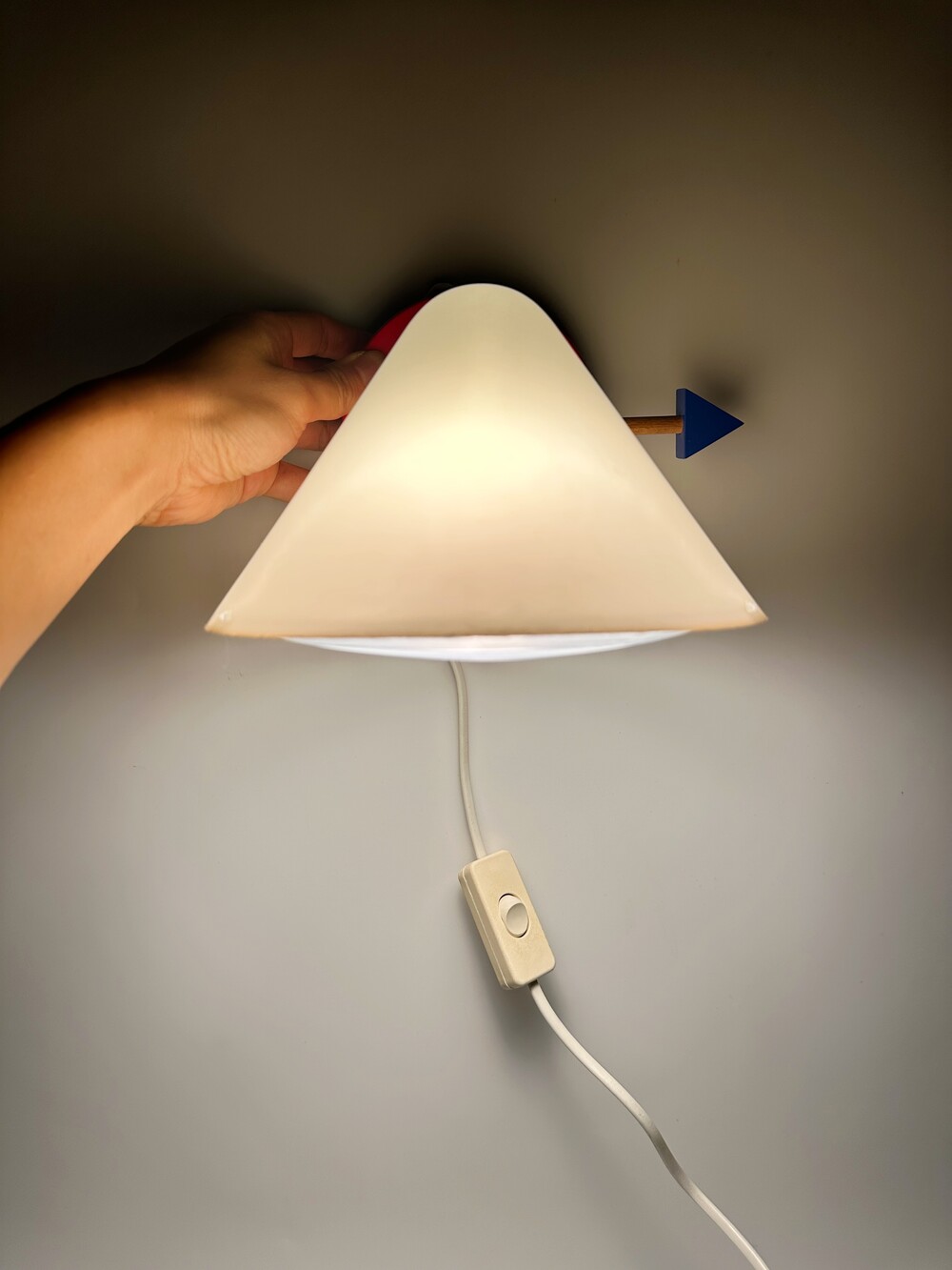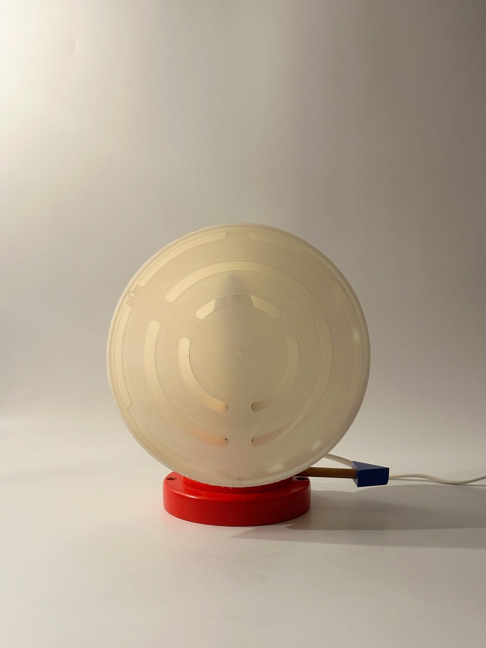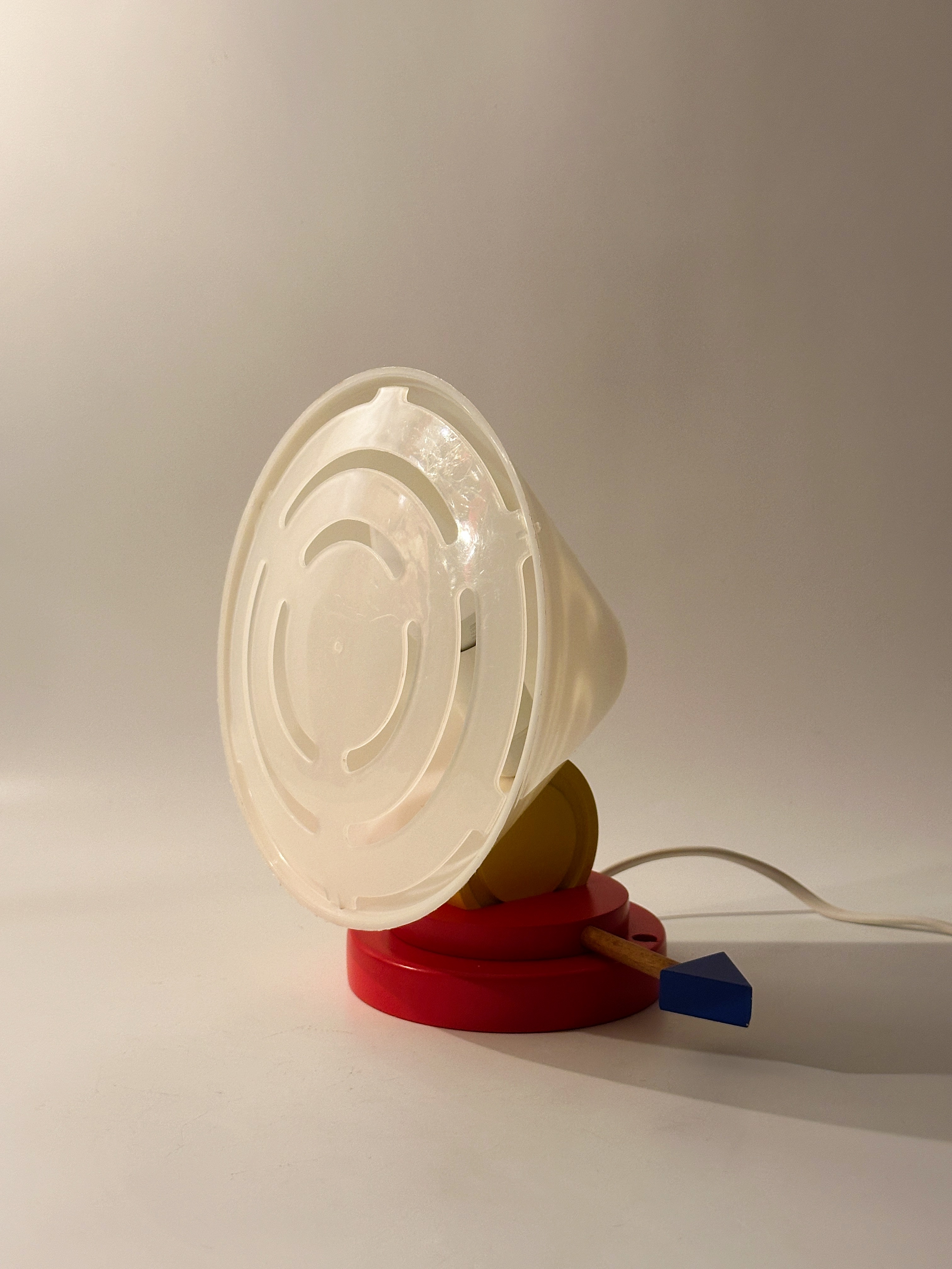 붉은 원형 베이스 위로 뾰족하게 뻗은 흰색 원뿔 갓, 그리고 그 뒤를 받치는 파란 화살촉 모양의 손잡이, 마치 팝아트의 작품 같아요 ❤️🤍💙