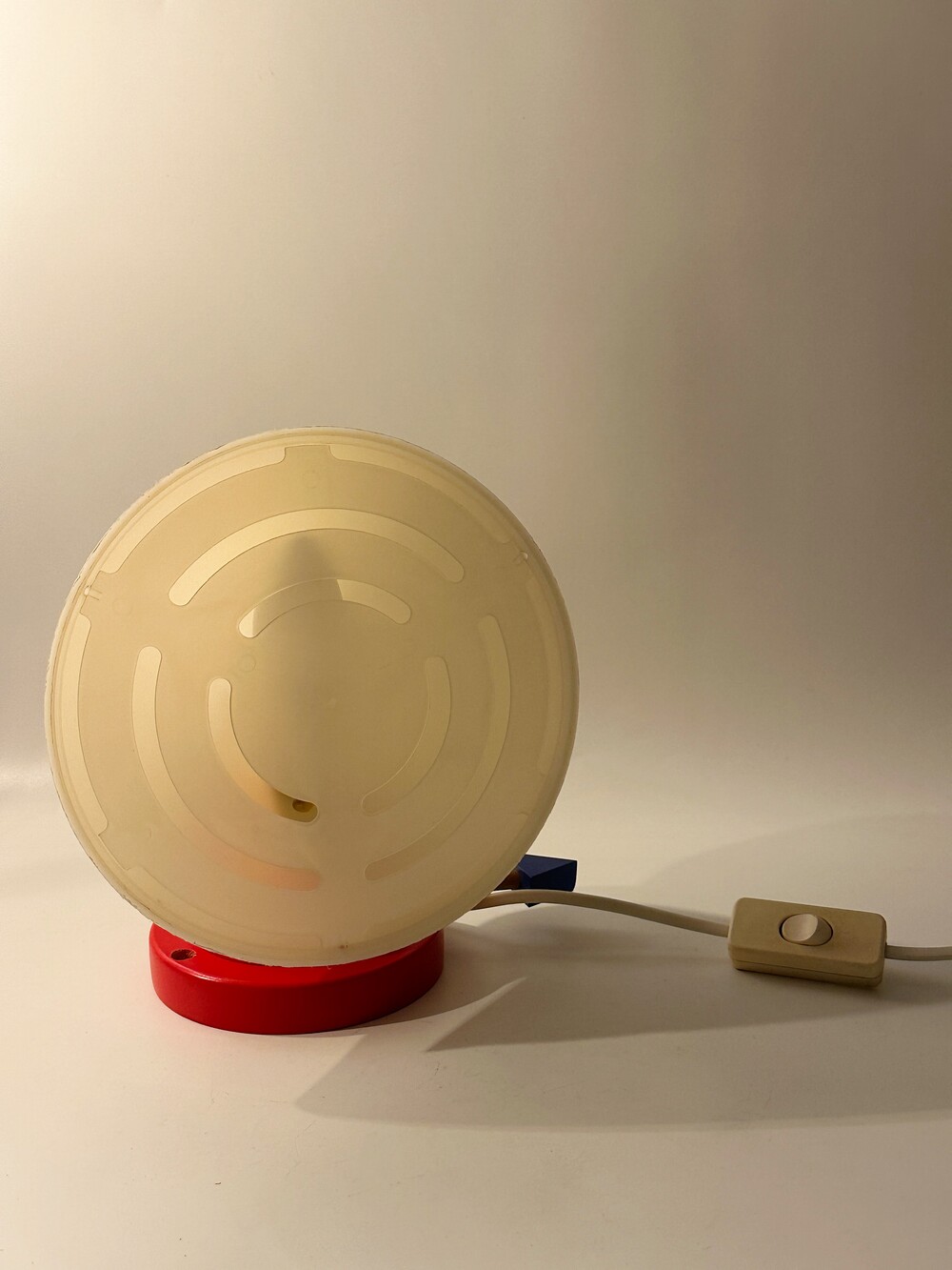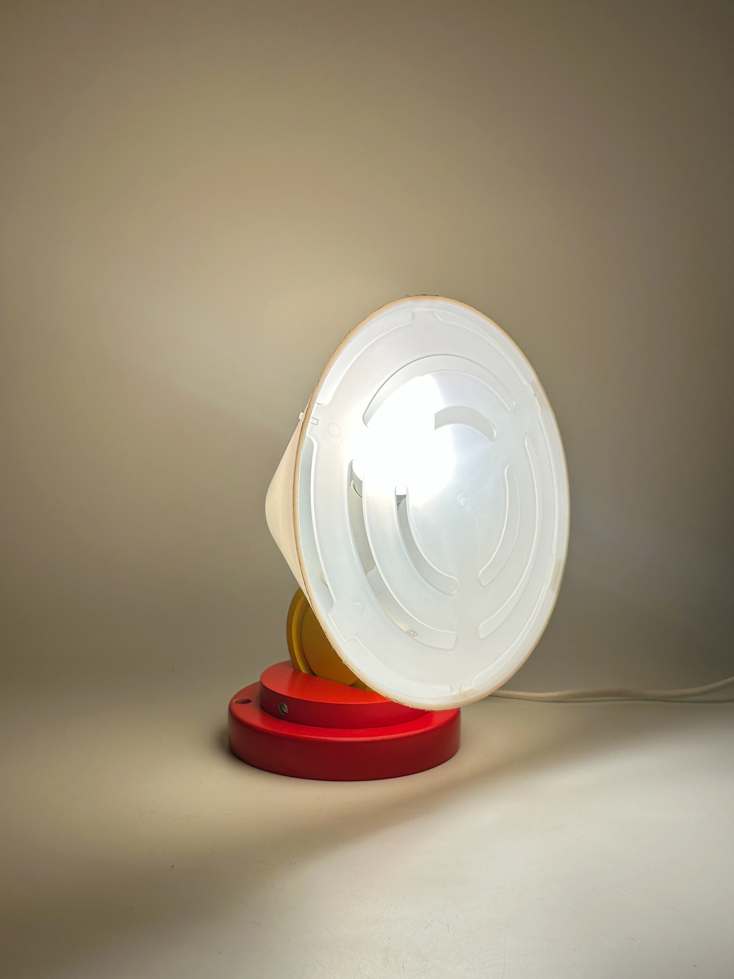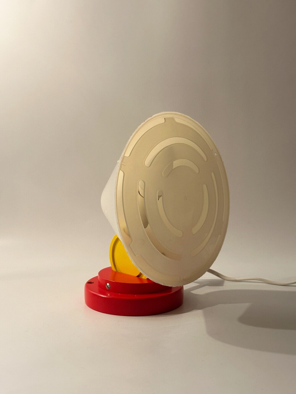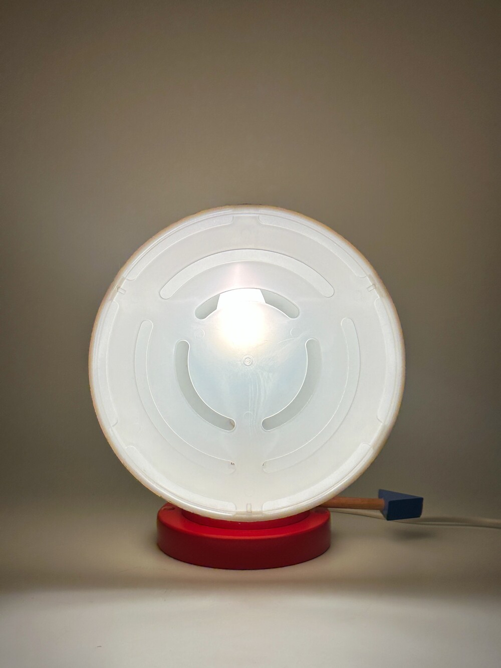 붉은 원형 베이스 위로 뾰족하게 뻗은 흰색 원뿔 갓, 그리고 그 뒤를 받치는 파란 화살촉 모양의 손잡이, 마치 팝아트의 작품 같아요 ❤️🤍💙