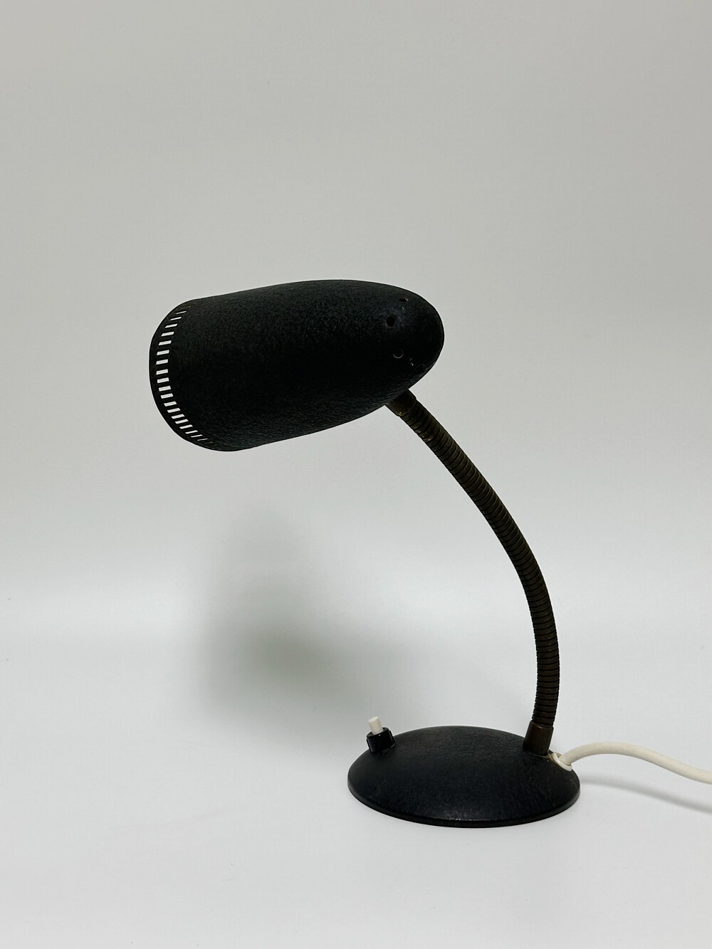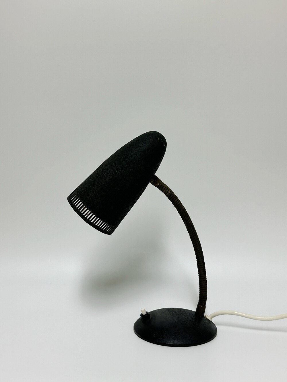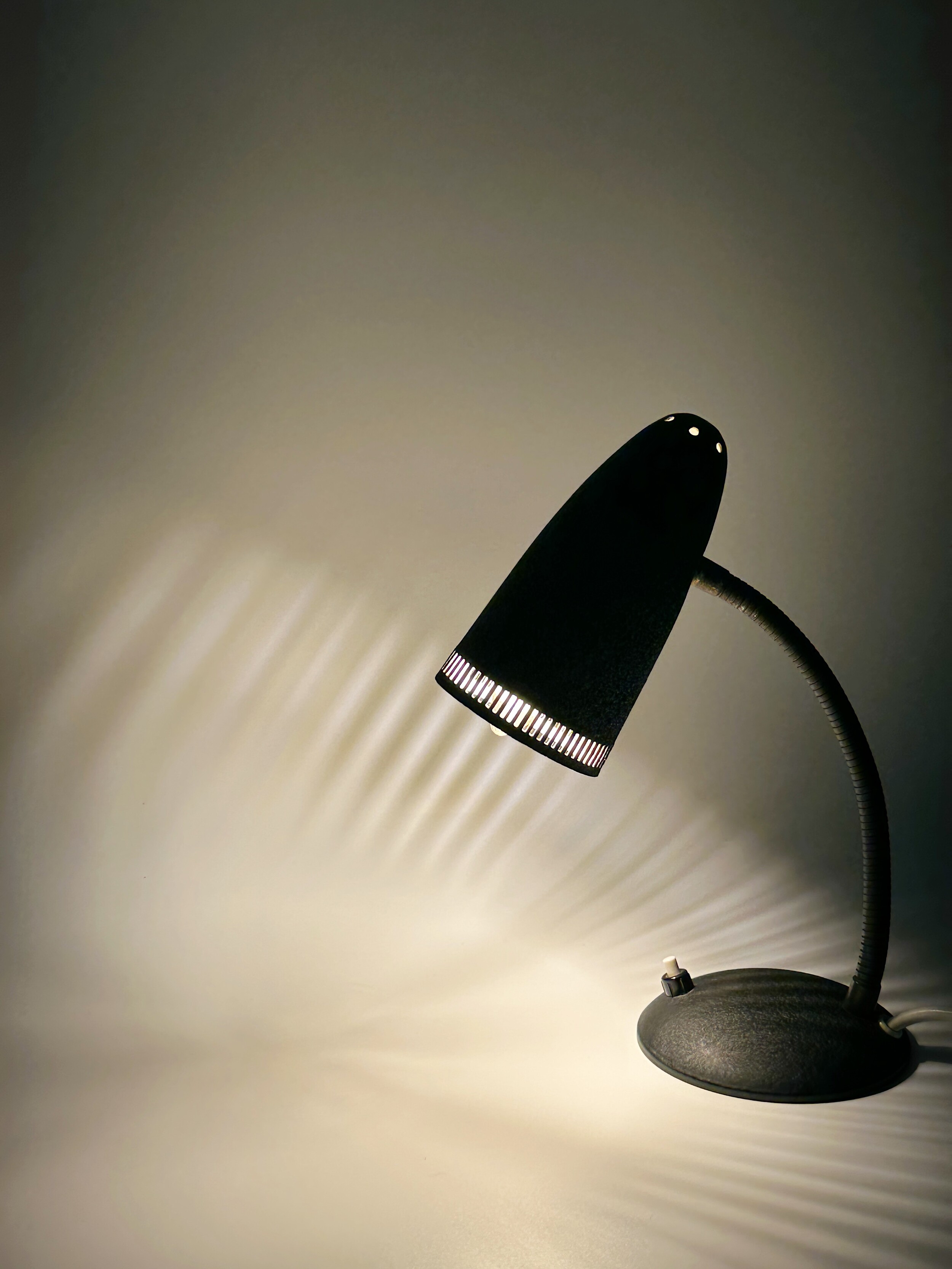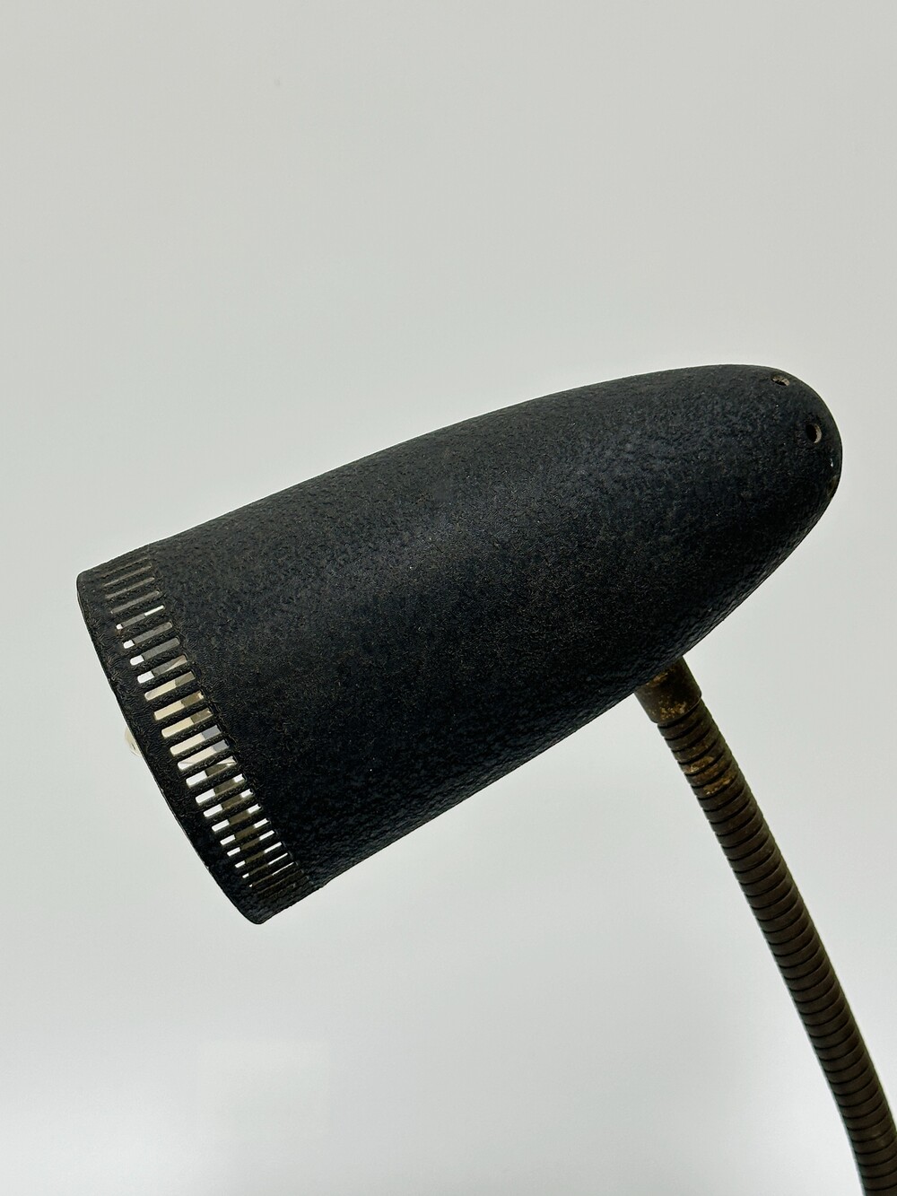 독일에서 넘어온 70년대 인더스트리얼 빈티지 조명이에요. 작업 및 실용적인 사용에 맞춰서 각도의 조절을 다양하게 하게 위해 넥 부분은 메탈 소재로 구스넥 형태를 통해 다각도로 빛을 제공할 수 있습니다. 또한 헤드 부분 끝에 슬림한 슬릿들 때문에 은은하고 화려한 빛 번짐을 즐길 수 있답니다.당시 주된 재료인 금속 위주의 재료로 만들어져 있으며, 베이스와 갓은 먼지나 기름에 강하고 오래 사용할 수 있도록 텍스처 페인트 마감이 된 것이 매력적이에요. ✨✨✨