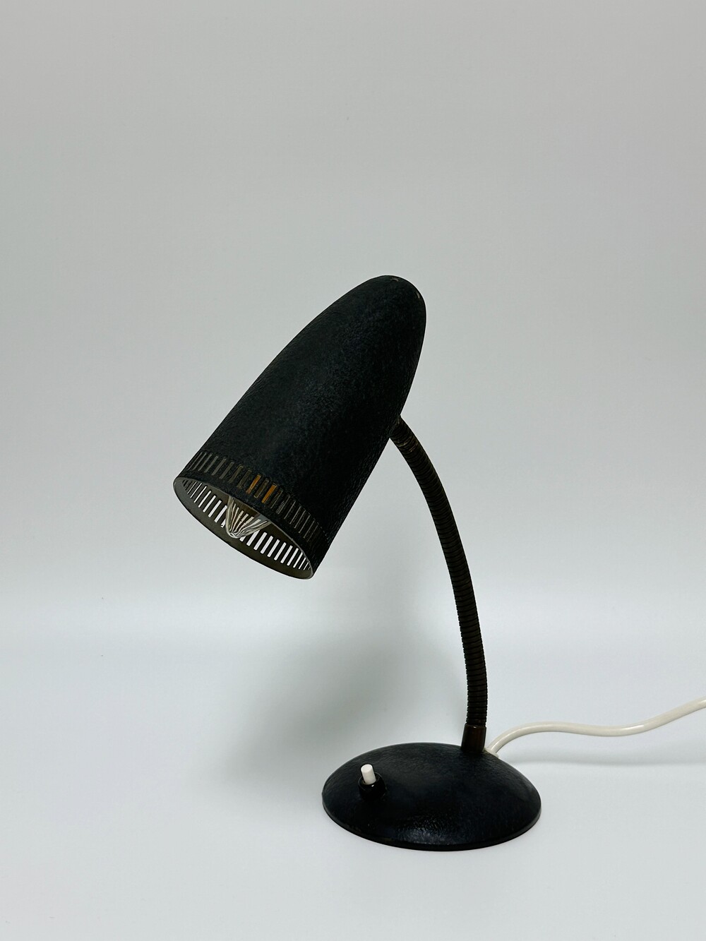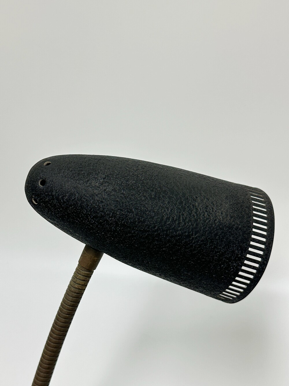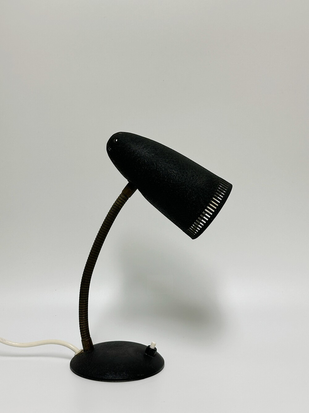 독일에서 넘어온 70년대 인더스트리얼 빈티지 조명이에요. 작업 및 실용적인 사용에 맞춰서 각도의 조절을 다양하게 하게 위해 넥 부분은 메탈 소재로 구스넥 형태를 통해 다각도로 빛을 제공할 수 있습니다. 또한 헤드 부분 끝에 슬림한 슬릿들 때문에 은은하고 화려한 빛 번짐을 즐길 수 있답니다.당시 주된 재료인 금속 위주의 재료로 만들어져 있으며, 베이스와 갓은 먼지나 기름에 강하고 오래 사용할 수 있도록 텍스처 페인트 마감이 된 것이 매력적이에요. ✨✨✨