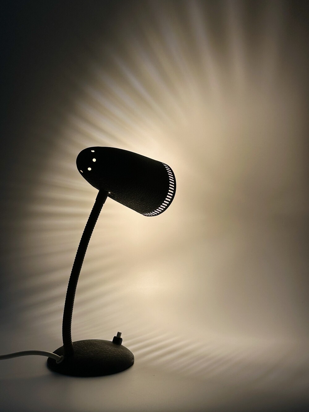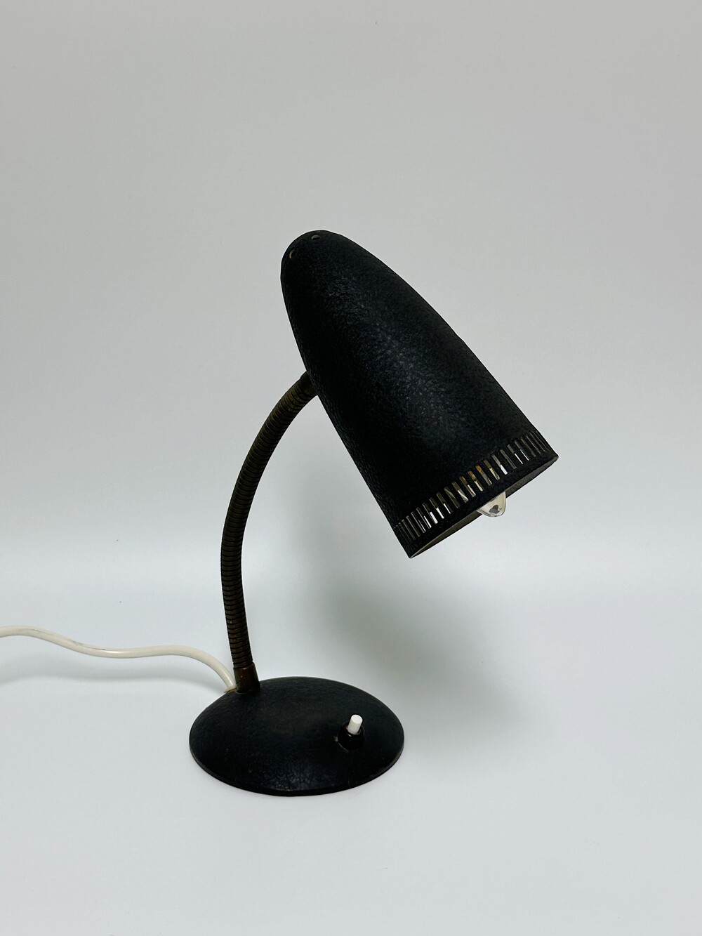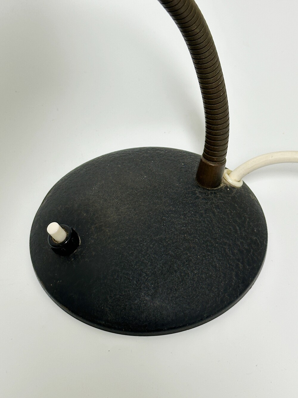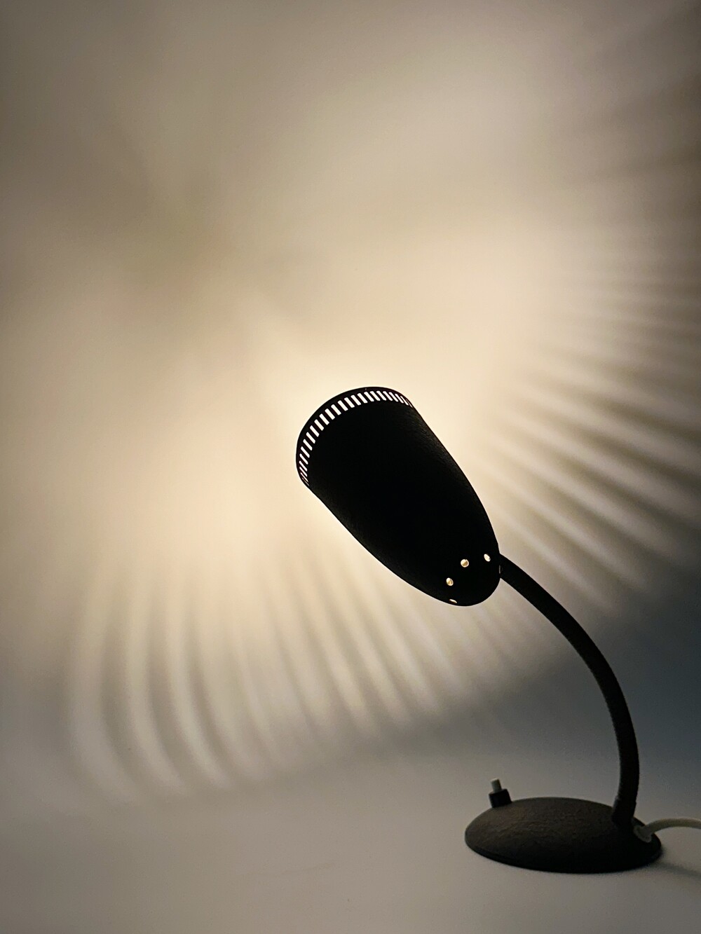 독일에서 넘어온 70년대 인더스트리얼 빈티지 조명이에요. 작업 및 실용적인 사용에 맞춰서 각도의 조절을 다양하게 하게 위해 넥 부분은 메탈 소재로 구스넥 형태를 통해 다각도로 빛을 제공할 수 있습니다. 또한 헤드 부분 끝에 슬림한 슬릿들 때문에 은은하고 화려한 빛 번짐을 즐길 수 있답니다.당시 주된 재료인 금속 위주의 재료로 만들어져 있으며, 베이스와 갓은 먼지나 기름에 강하고 오래 사용할 수 있도록 텍스처 페인트 마감이 된 것이 매력적이에요. ✨✨✨