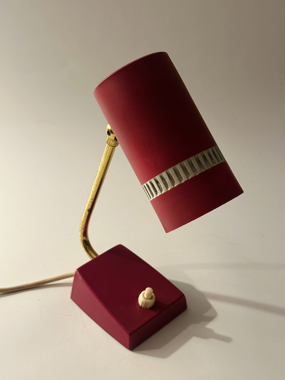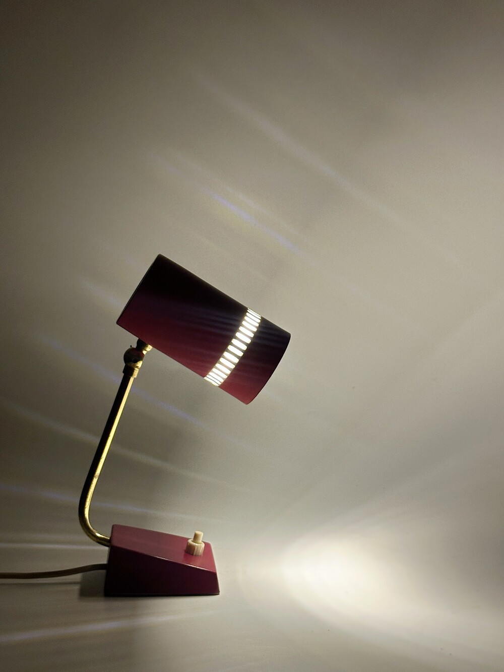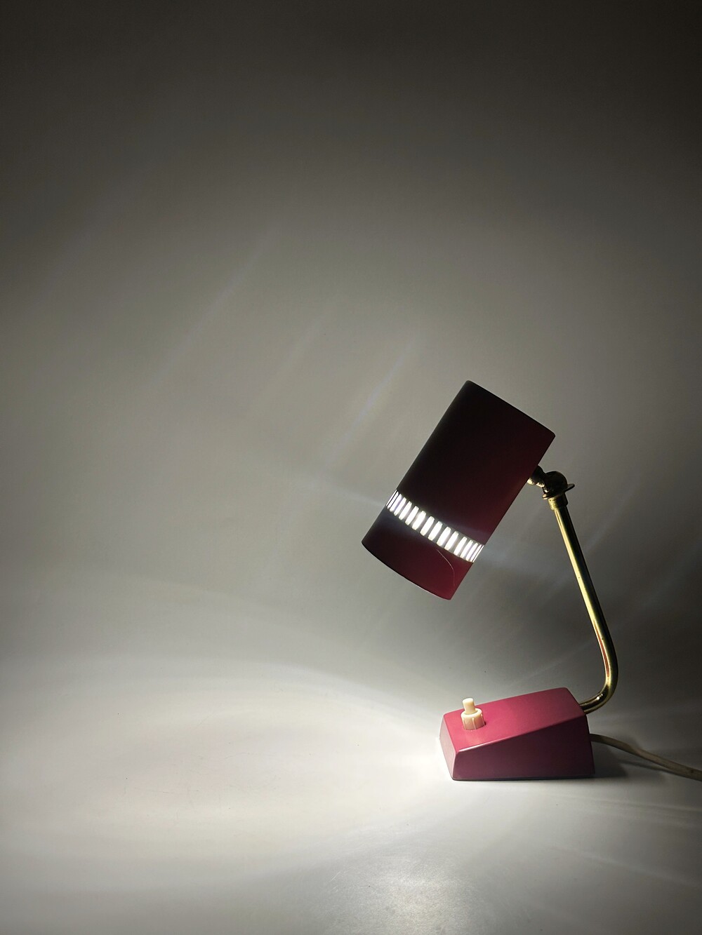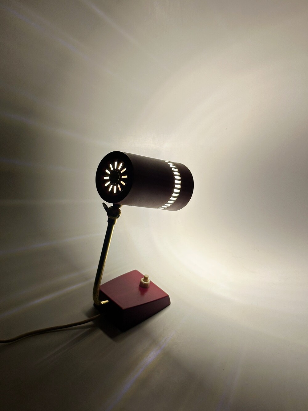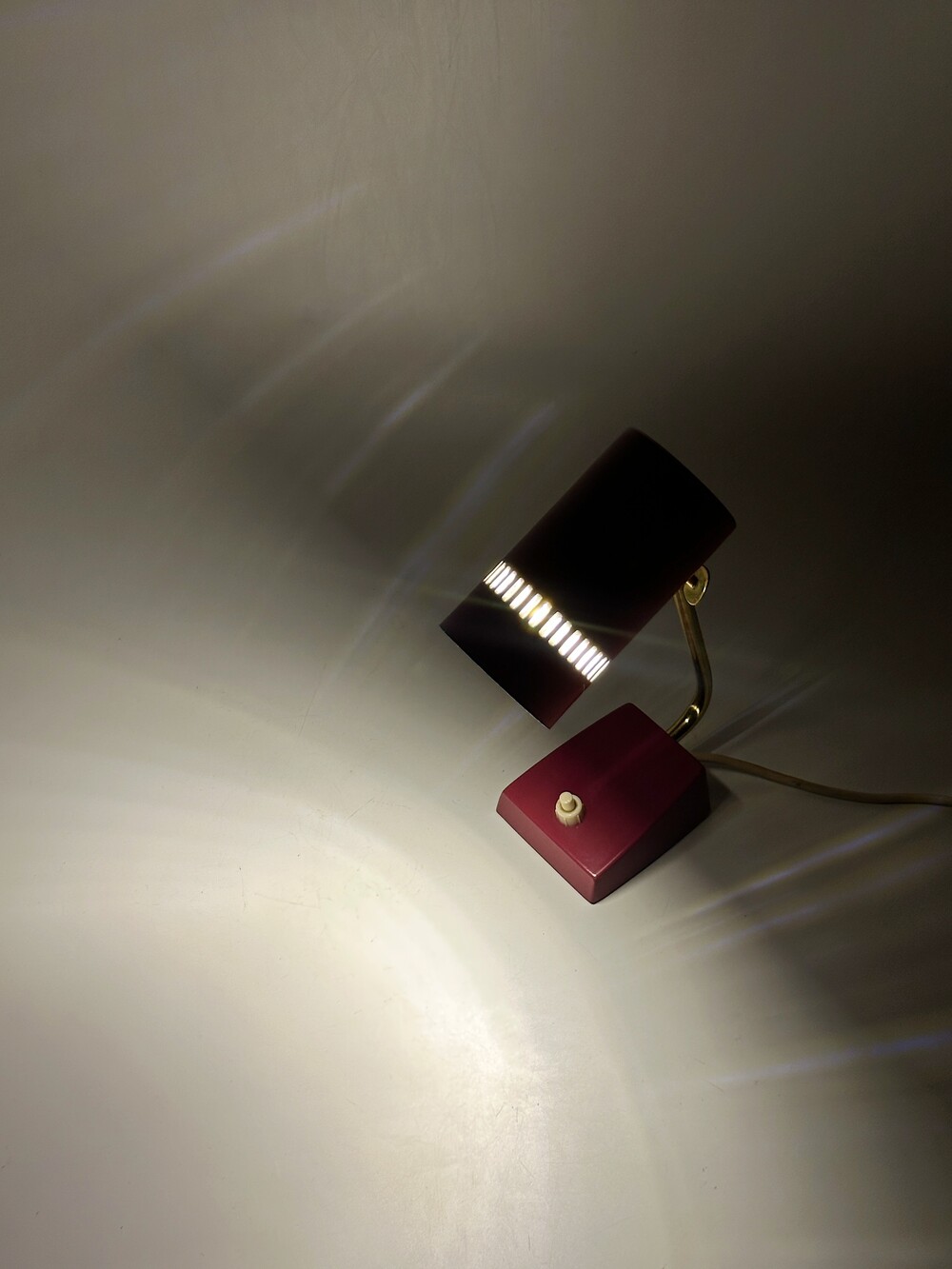 둥근 원통 형태의 헤드가 인상적인 70년대 독일 빈티지 베드사이드 램프에요. 헤드의 앞 부분에 일정한 간격의 슬릿을 통해 빛 번짐이 아름답게 펼쳐진답니다. 과하지 않고 은은하고 따뜻한 공간을 만들어준답니다. 헤드 부분 상하 조절이 가능하고, 골드빛 브라스 넥 부분이 고급스럽습니다. 침대 옆 협탁이나 서재쪽에 포인트 조명으로 활용하셔도 좋을 것 같아요! ✨