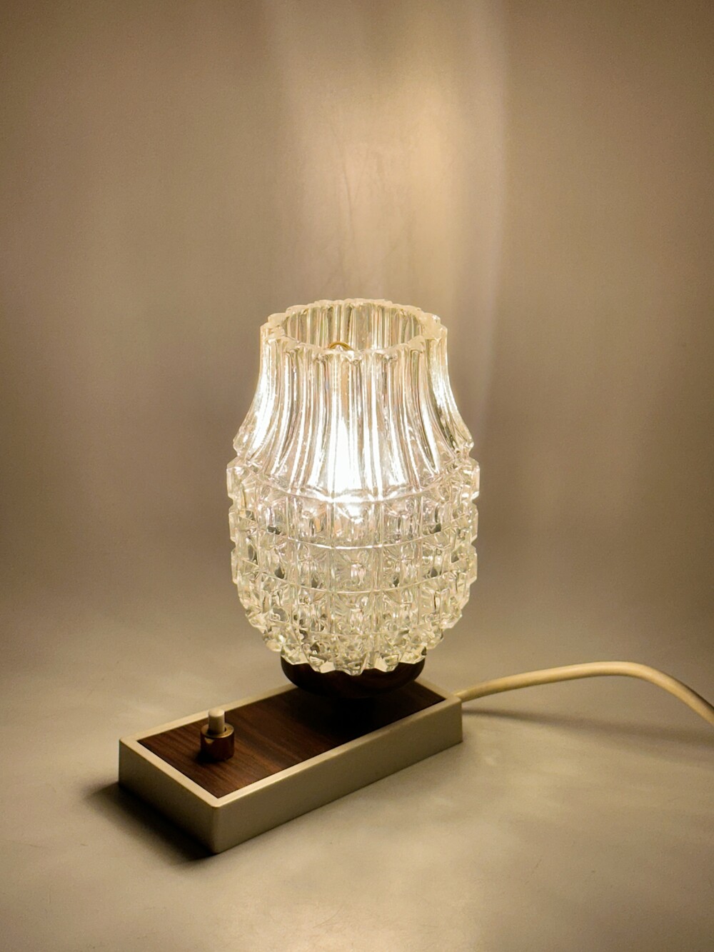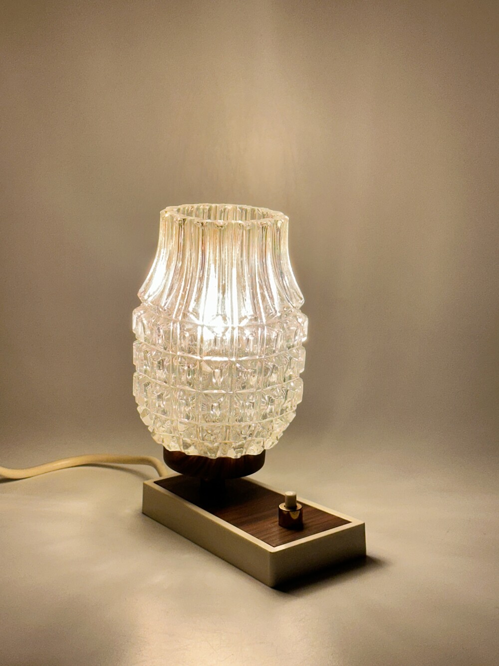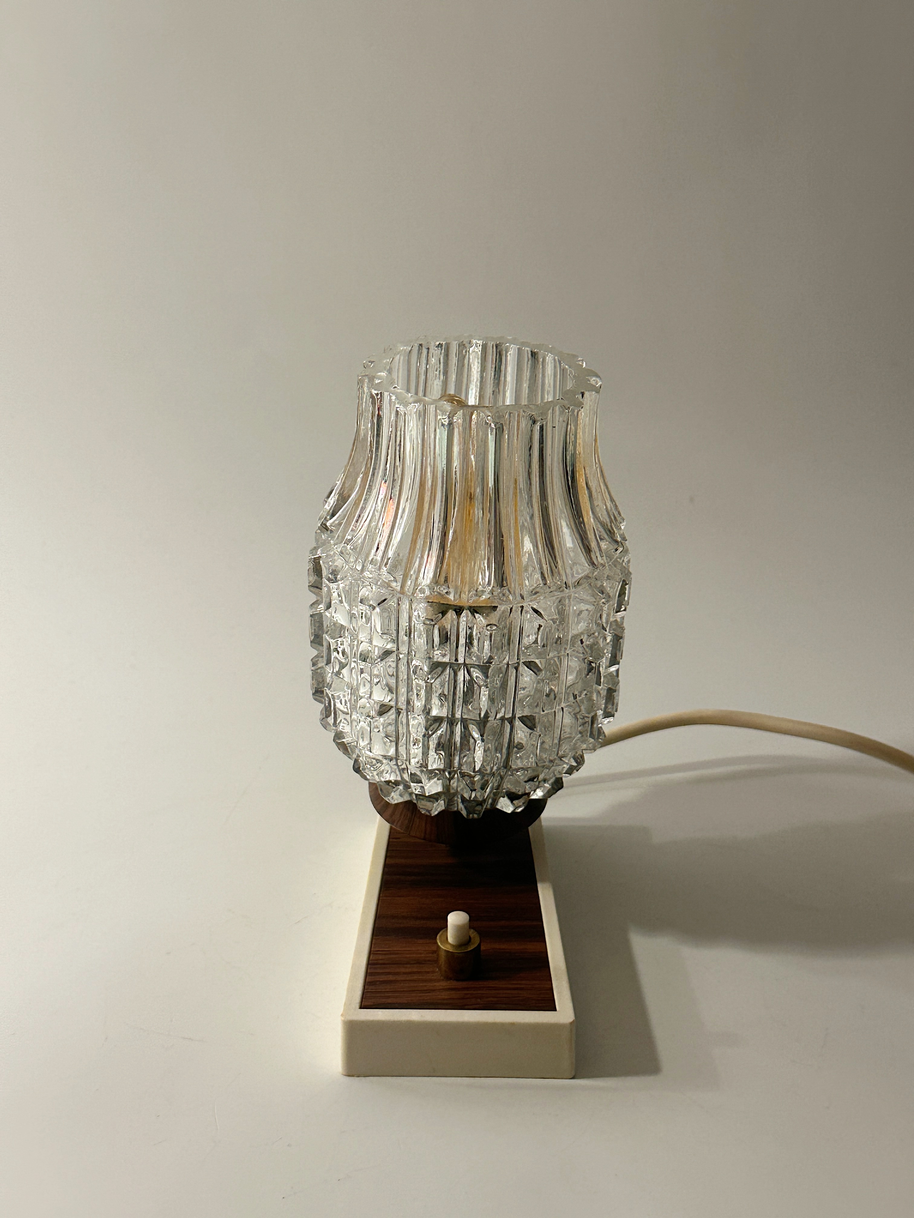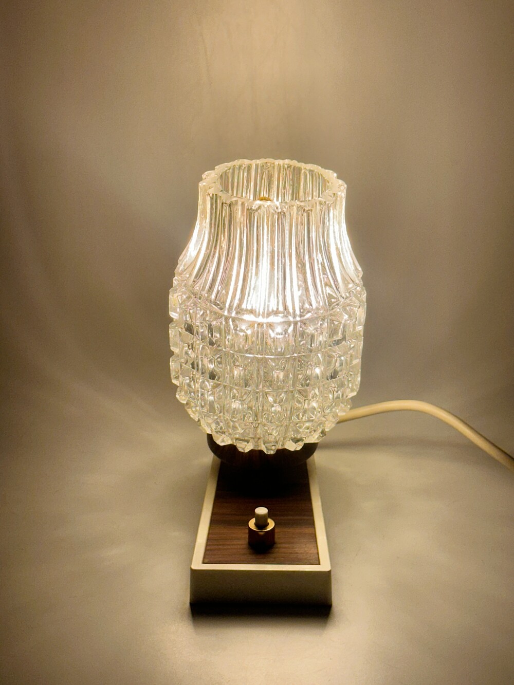 항아리같이 유려한 라인의 글래스가 인상적인 빈티지 조명이에요. 다이아 패턴의 텍스처로 구성이 된 글래스라서 전원을 키면 아름다운 빛 번짐이 펼쳐진답니다. 화이트 컬러의 베이스에 고급스러운 월넛 우드 패널이 매립되어 조금 더 따뜻한 느낌을 느낄 수 있습니다. 전원 버튼도 고급스러운 황동과 살짝 나온 플라스틱 버튼의 디테일이 귀엽습니다. 침대 옆 협탁에 두어 포근한 빛과 하루를 마감하시면 어떨까요!? ✨