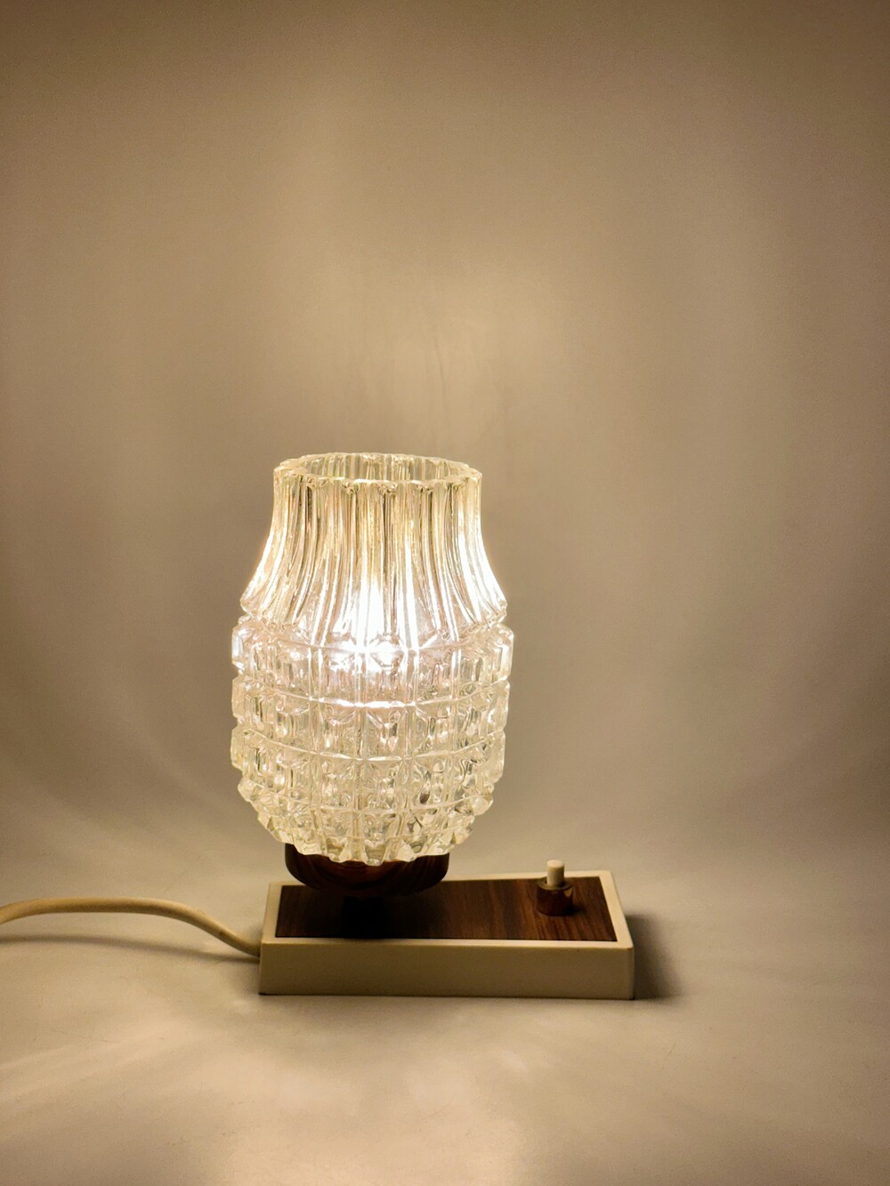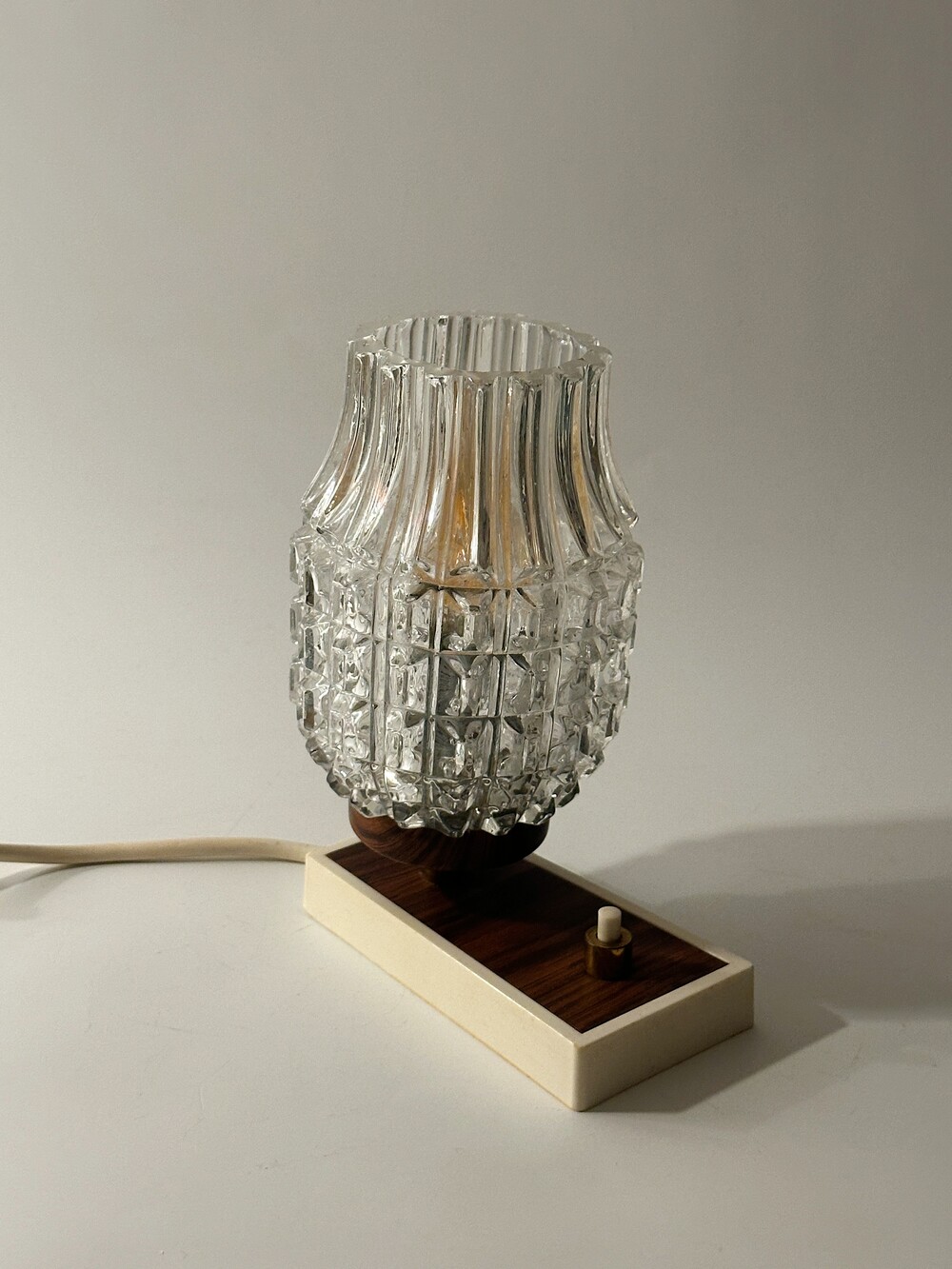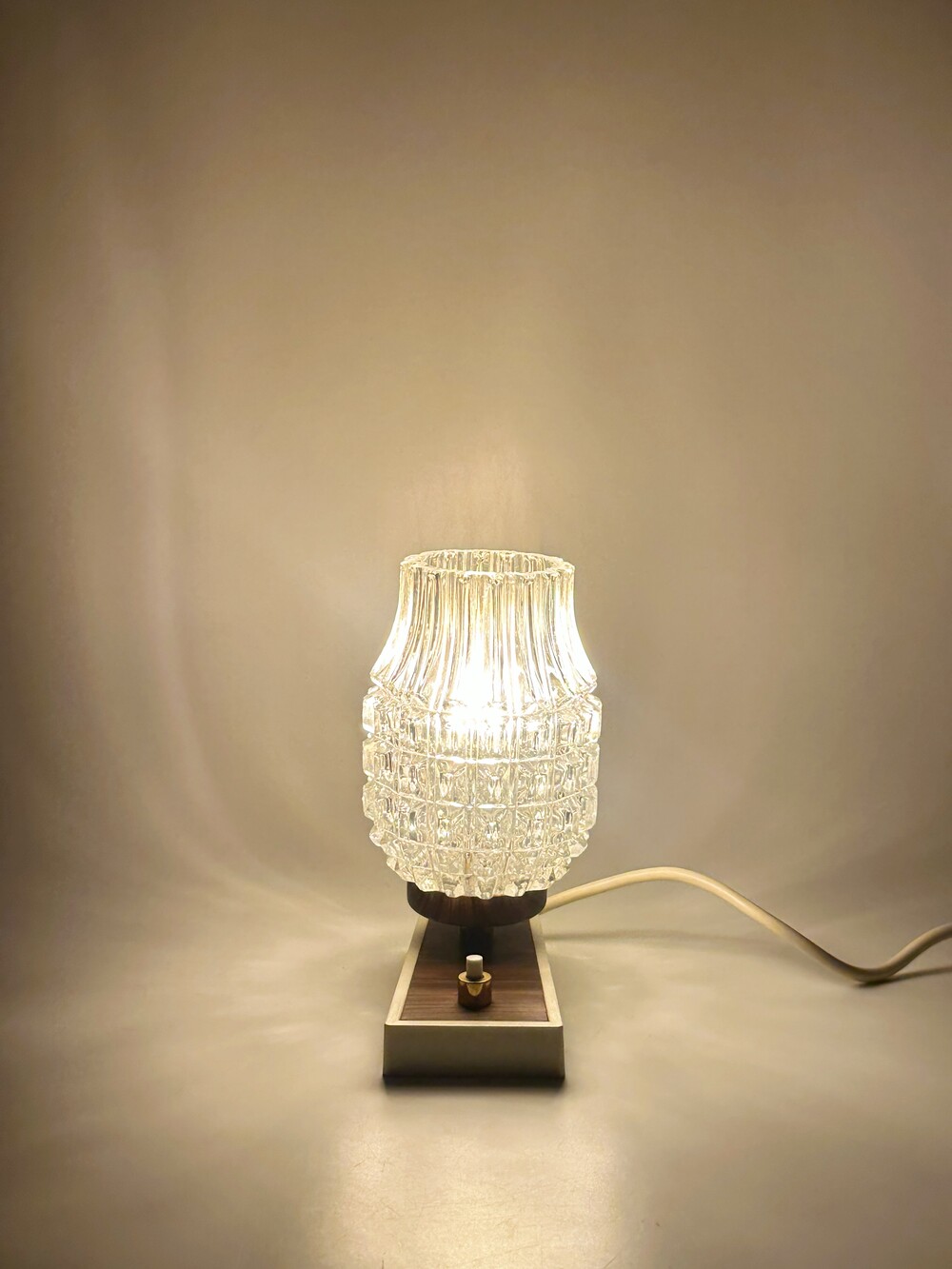 항아리같이 유려한 라인의 글래스가 인상적인 빈티지 조명이에요. 다이아 패턴의 텍스처로 구성이 된 글래스라서 전원을 키면 아름다운 빛 번짐이 펼쳐진답니다. 화이트 컬러의 베이스에 고급스러운 월넛 우드 패널이 매립되어 조금 더 따뜻한 느낌을 느낄 수 있습니다. 전원 버튼도 고급스러운 황동과 살짝 나온 플라스틱 버튼의 디테일이 귀엽습니다. 침대 옆 협탁에 두어 포근한 빛과 하루를 마감하시면 어떨까요!? ✨