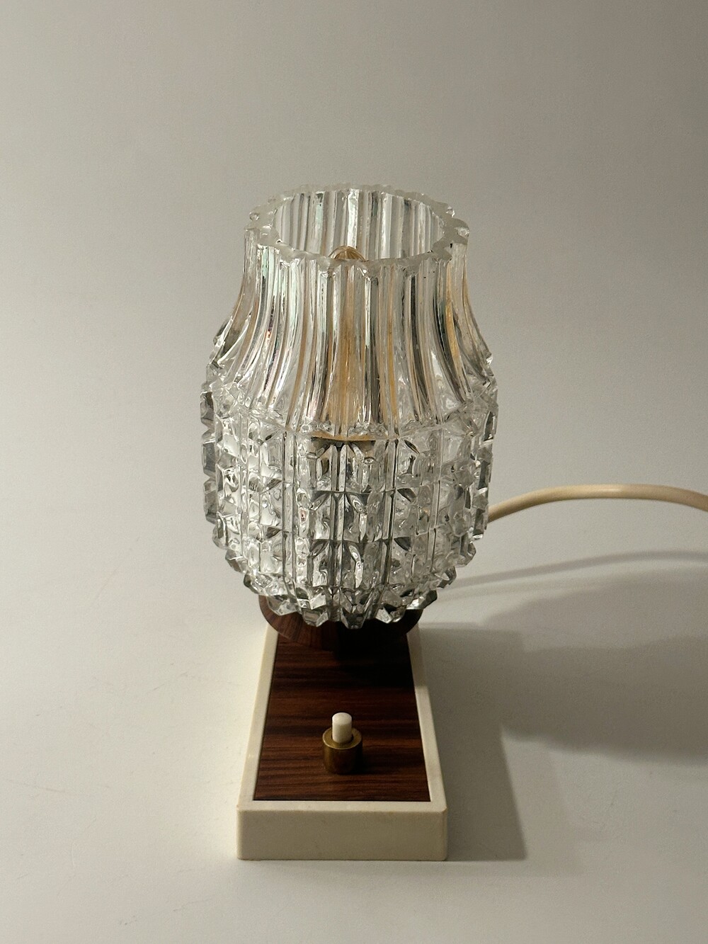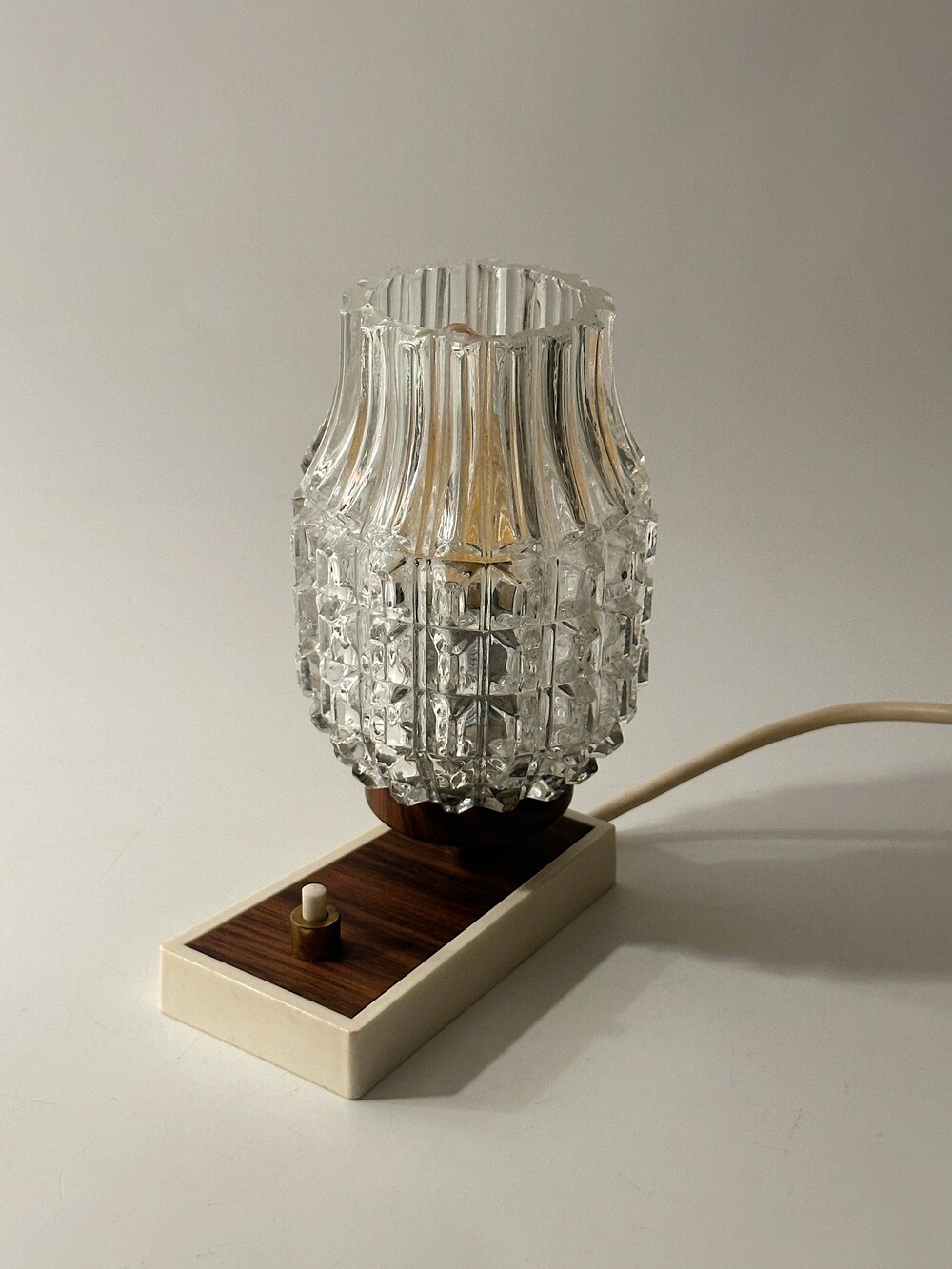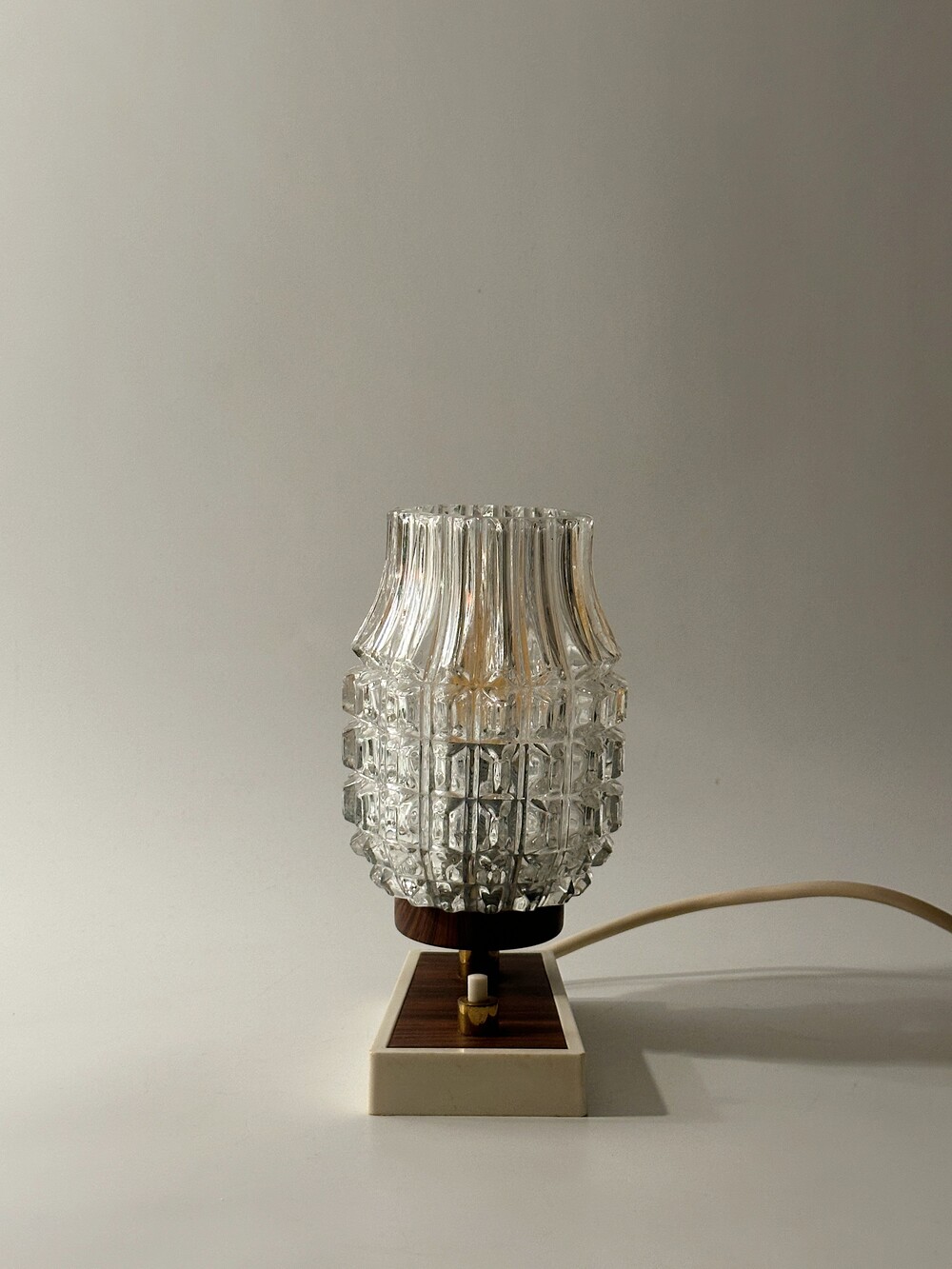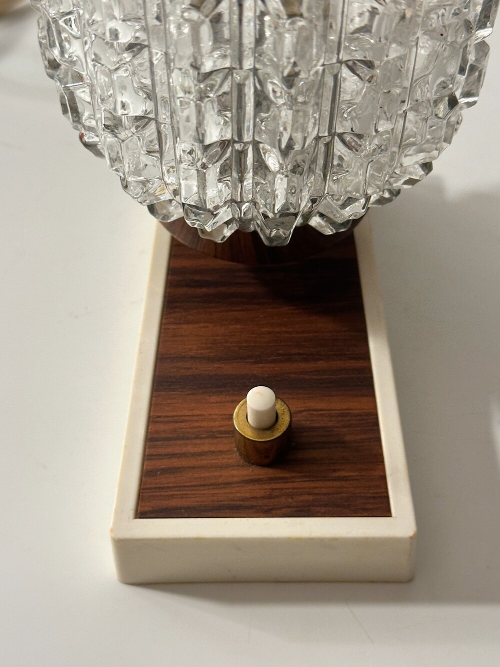 항아리같이 유려한 라인의 글래스가 인상적인 빈티지 조명이에요. 다이아 패턴의 텍스처로 구성이 된 글래스라서 전원을 키면 아름다운 빛 번짐이 펼쳐진답니다. 화이트 컬러의 베이스에 고급스러운 월넛 우드 패널이 매립되어 조금 더 따뜻한 느낌을 느낄 수 있습니다. 전원 버튼도 고급스러운 황동과 살짝 나온 플라스틱 버튼의 디테일이 귀엽습니다. 침대 옆 협탁에 두어 포근한 빛과 하루를 마감하시면 어떨까요!? ✨