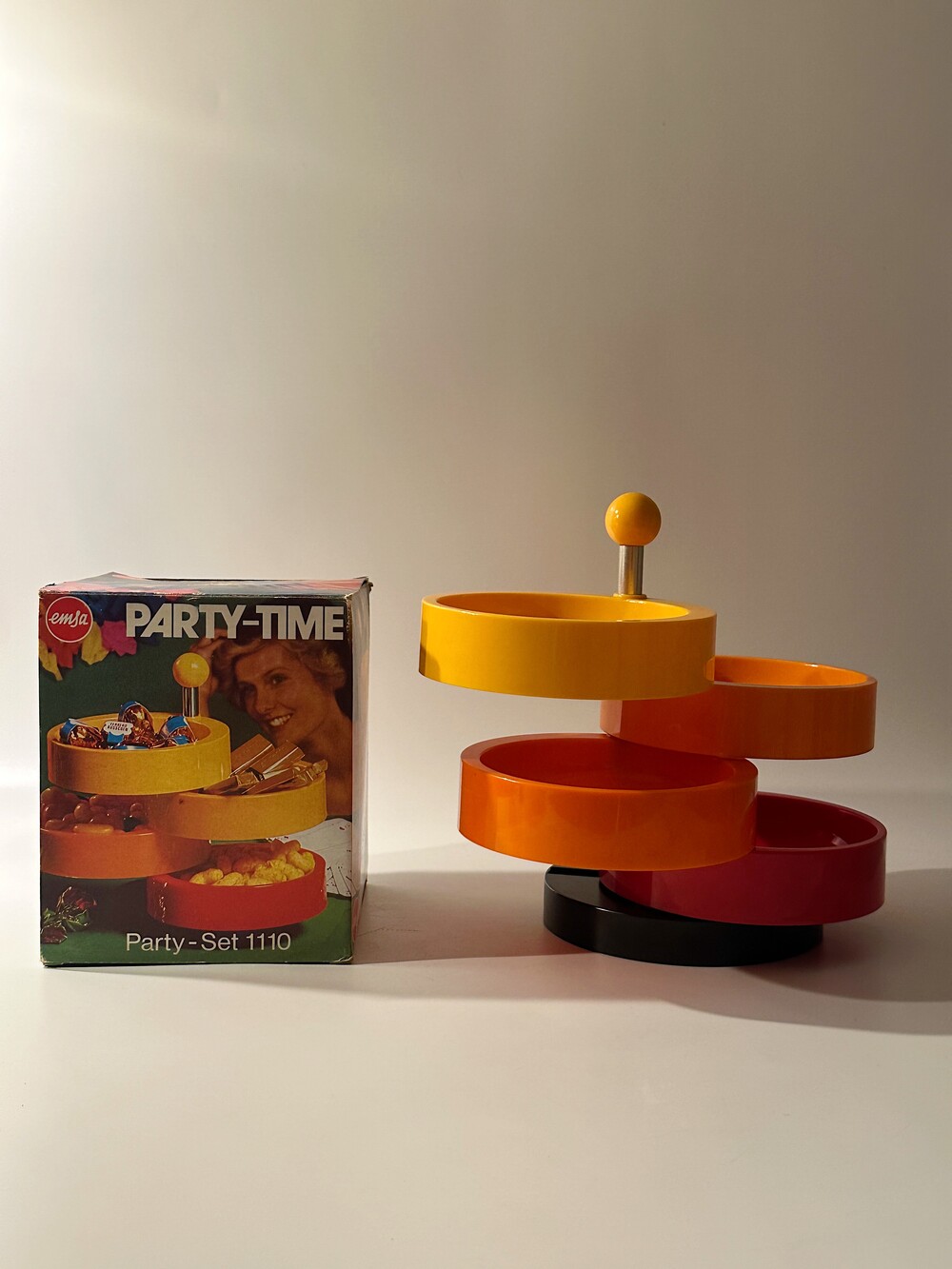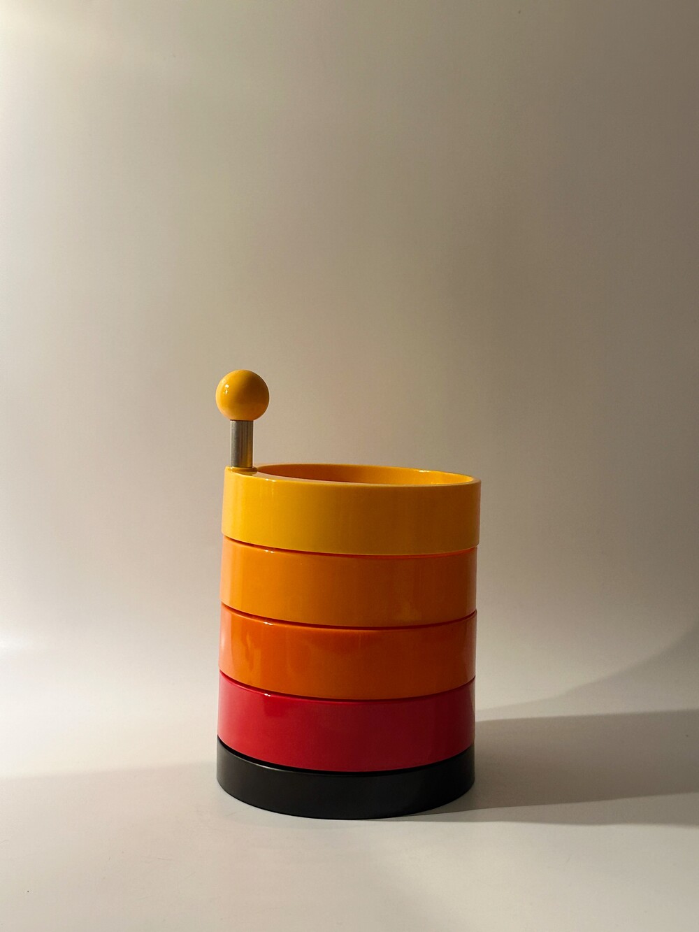 70년대 독일 ESMA 사에서 생산된 빈티지 플라스틱 트레이입니다.검정 빨강 주황 그리고 노랑색까지 다채로운 색상으로 이루어져있습니다. 과거엔 4가지 공간을 이용하여 스낵&디저트 파티를 즐겼겠죠? 시간의 변화에 따라 지금은 다양한 악세서리 동전 열쇠 등등 정리 및 수납이 가능합니다. 기둥을 중심으로 자유롭게 회전이 가능해 다양한 형태로 연출이 가능합니다. ⚫️🔴🟠🟠🟡