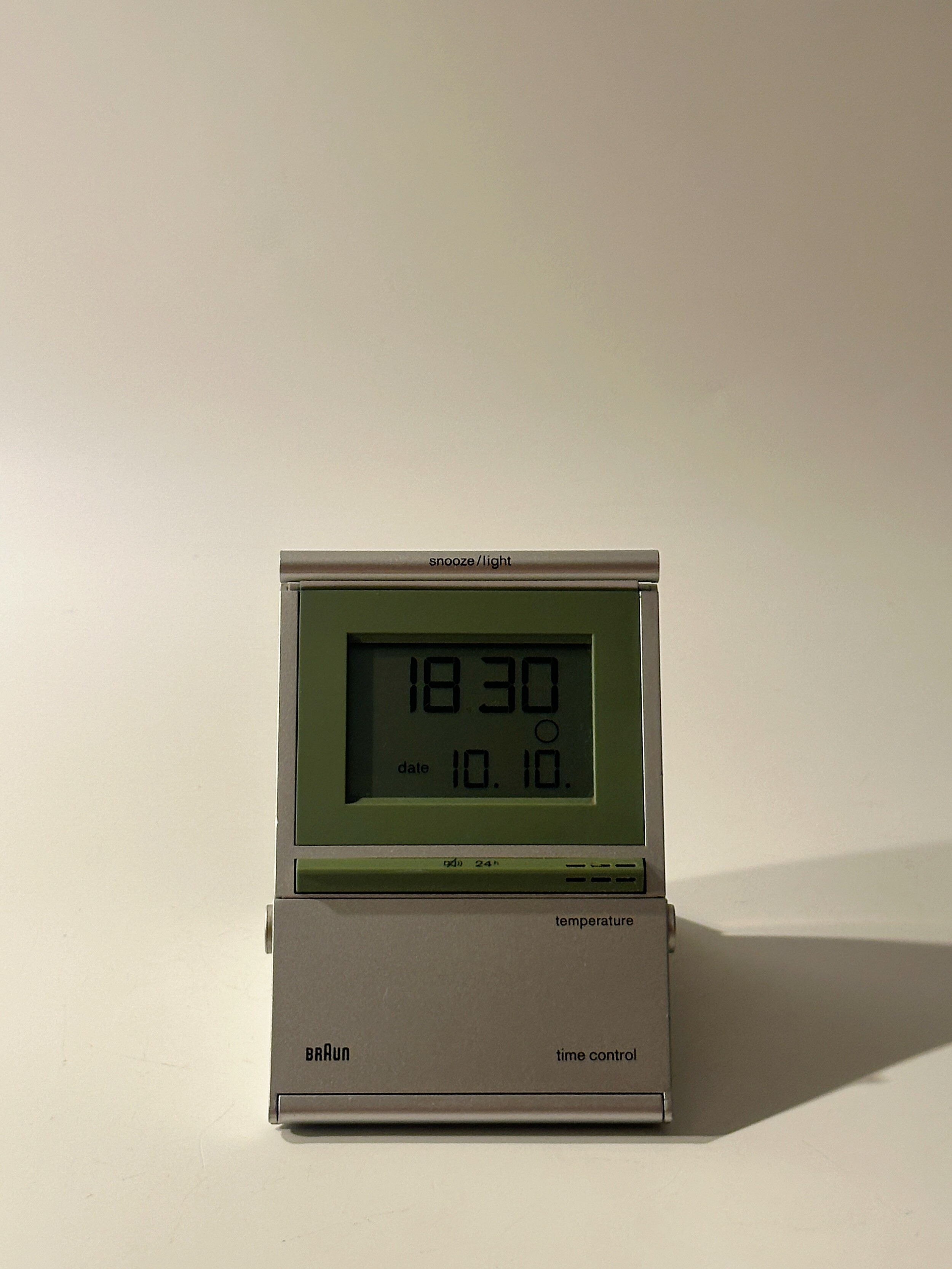 90년대 독일 Braun에서 만들어진 디지털 시계 DB 12 입니다. 디터람스의 철학이 담겨있기에 간결합니다. 작고 가벼운 크기라 당시에는 여행용으로 사용했겠죠? 저도 여행을 갈때면 휴대용 브라운 시계를 들고 다니곤 해요. 휴대폰 알람과 다른 감각을 즐겨보세요!