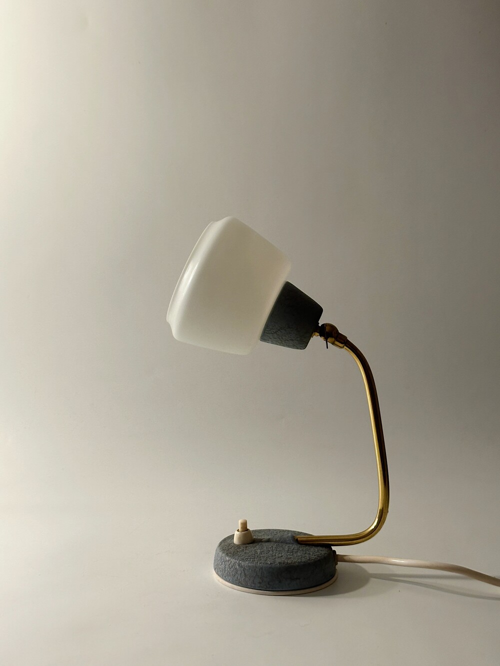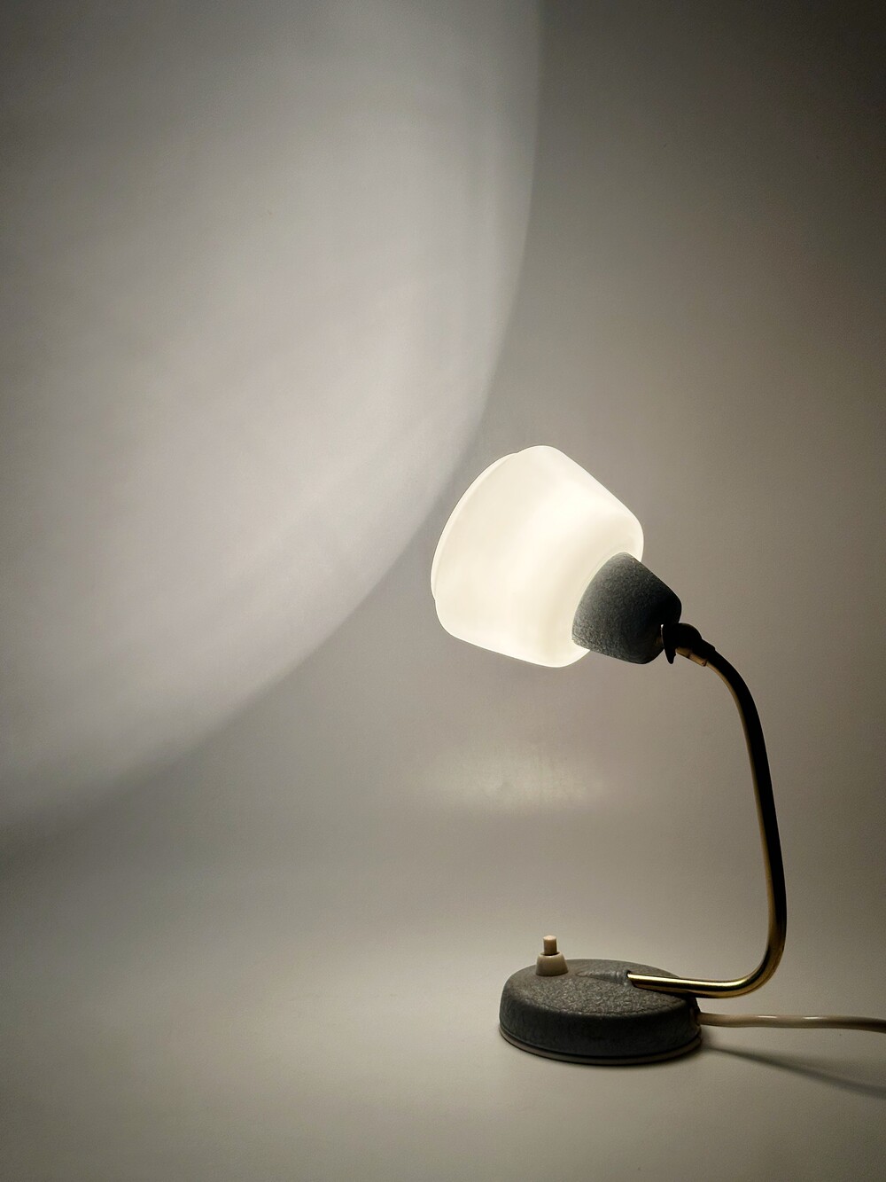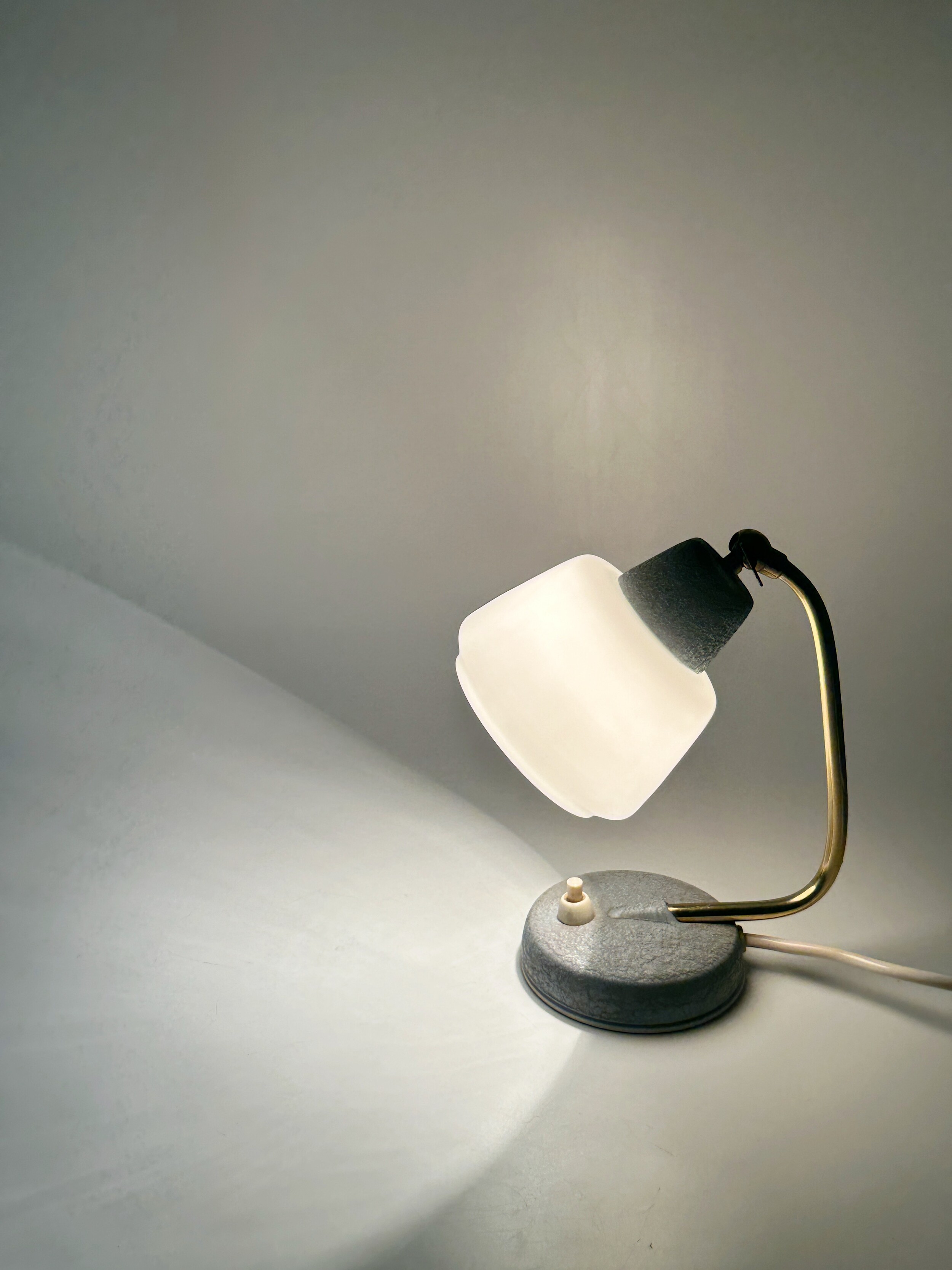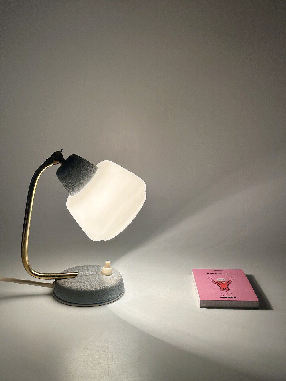 독일에서 넘어온 70년대 빈티지 베드사이드 조명이에요. 불투명한 우유빛 오팔 글래스는 직접적인 빛보단 은은한 빛을 제공해 안락한 분위기를 만들어준답니다. 우아하고 유연한 브라스 곡선 프레임은 고급스럽고 안정적이에요. 헤드 부분 상하 조절이 가능합니다. 마지막으로 베이스와 갓의 소재는 먼지나 기름에 강하고 오래 사용할 수 있도록 텍스처 페인트 마감이 되어 자연스러운 에이징을 느낄 수 있습니다. 컬러감은 다소 레어한 블루 그레이톤에 가깝습니다. ✨