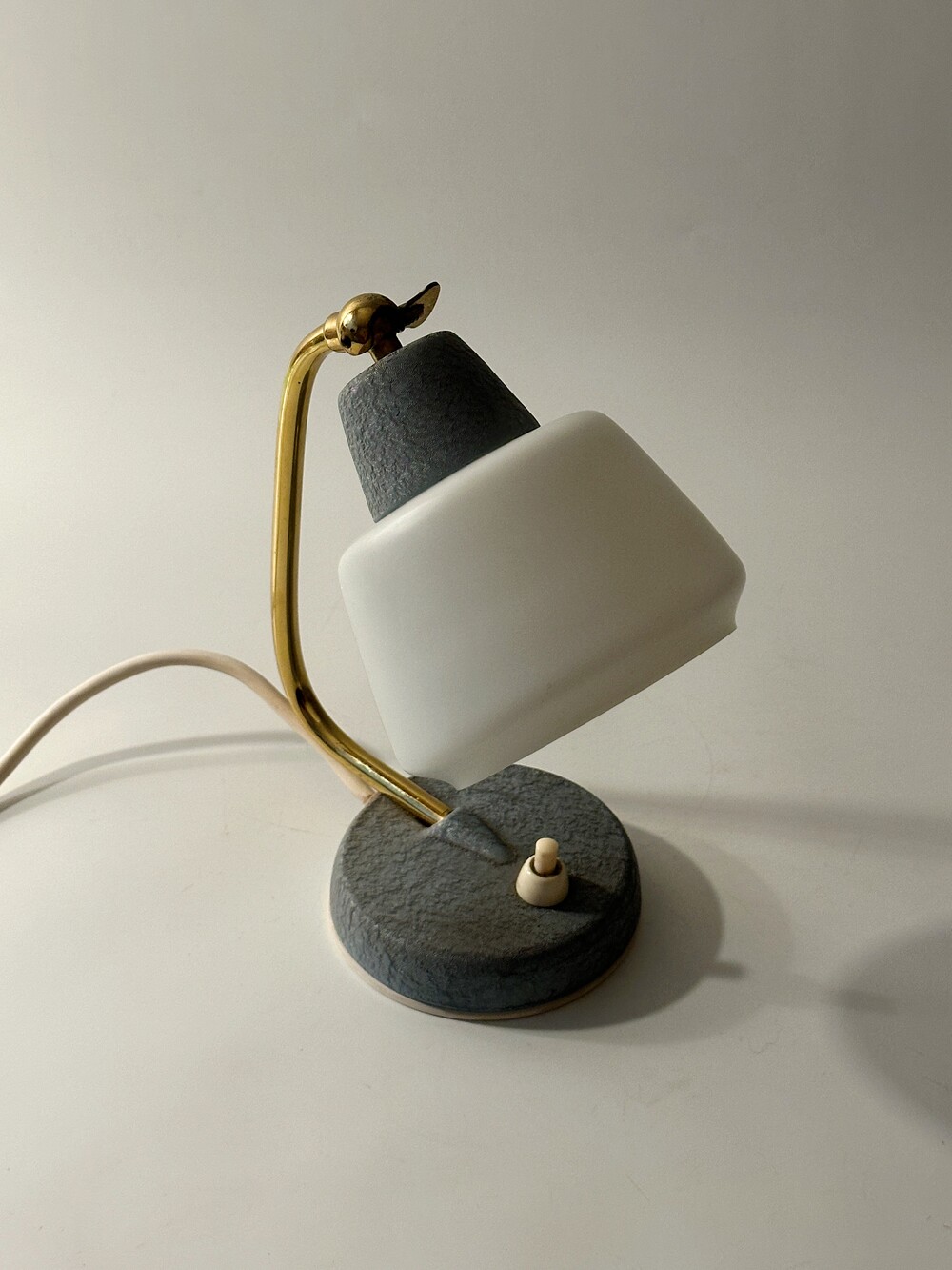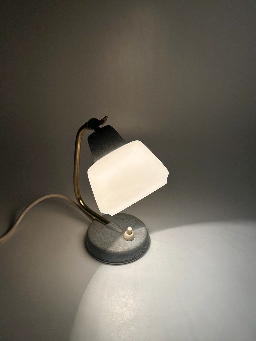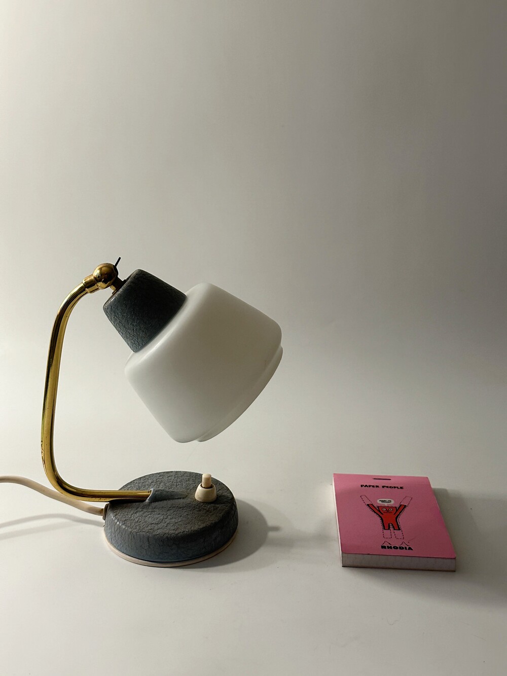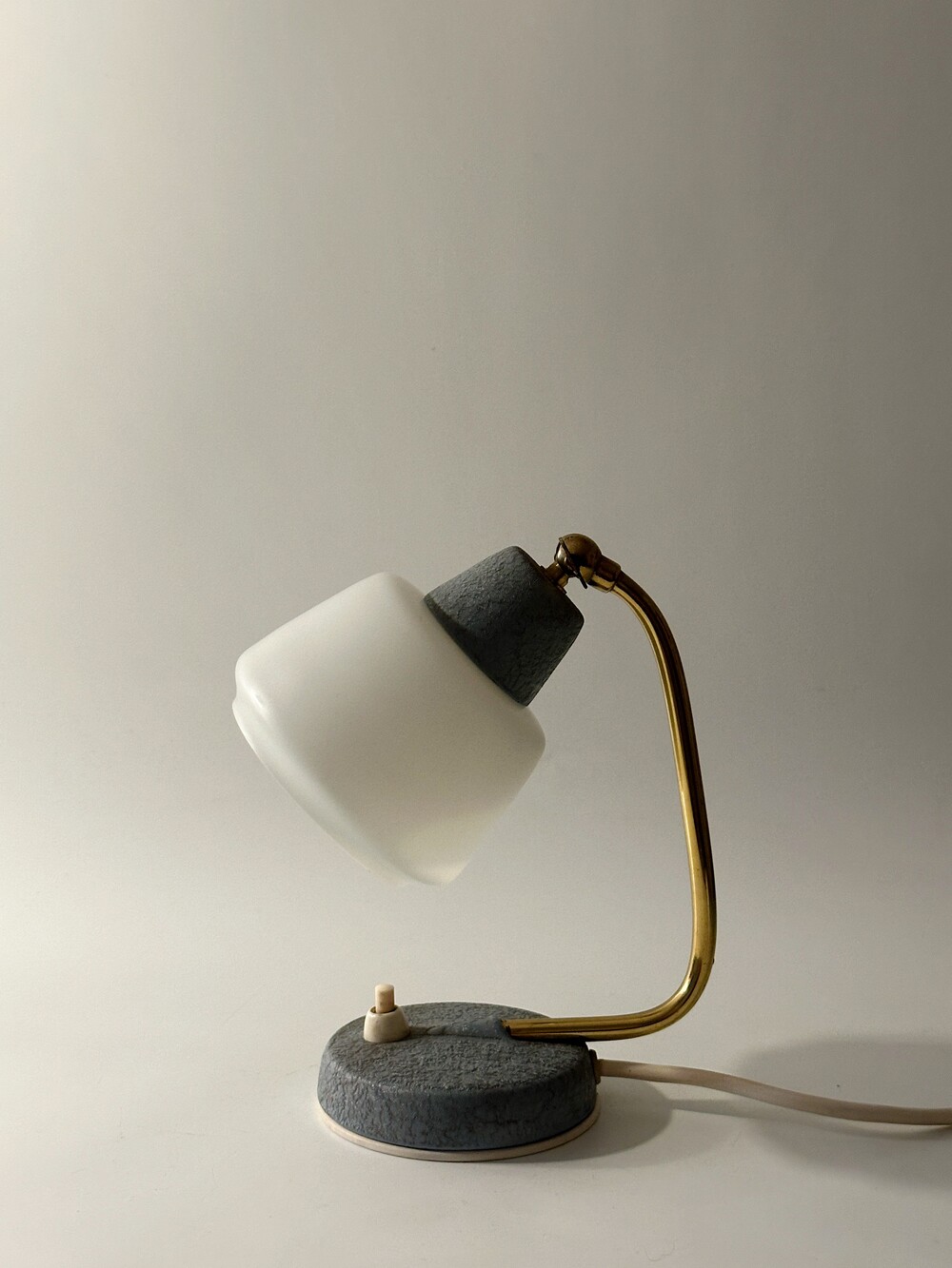 독일에서 넘어온 70년대 빈티지 베드사이드 조명이에요. 불투명한 우유빛 오팔 글래스는 직접적인 빛보단 은은한 빛을 제공해 안락한 분위기를 만들어준답니다. 우아하고 유연한 브라스 곡선 프레임은 고급스럽고 안정적이에요. 헤드 부분 상하 조절이 가능합니다. 마지막으로 베이스와 갓의 소재는 먼지나 기름에 강하고 오래 사용할 수 있도록 텍스처 페인트 마감이 되어 자연스러운 에이징을 느낄 수 있습니다. 컬러감은 다소 레어한 블루 그레이톤에 가깝습니다. ✨