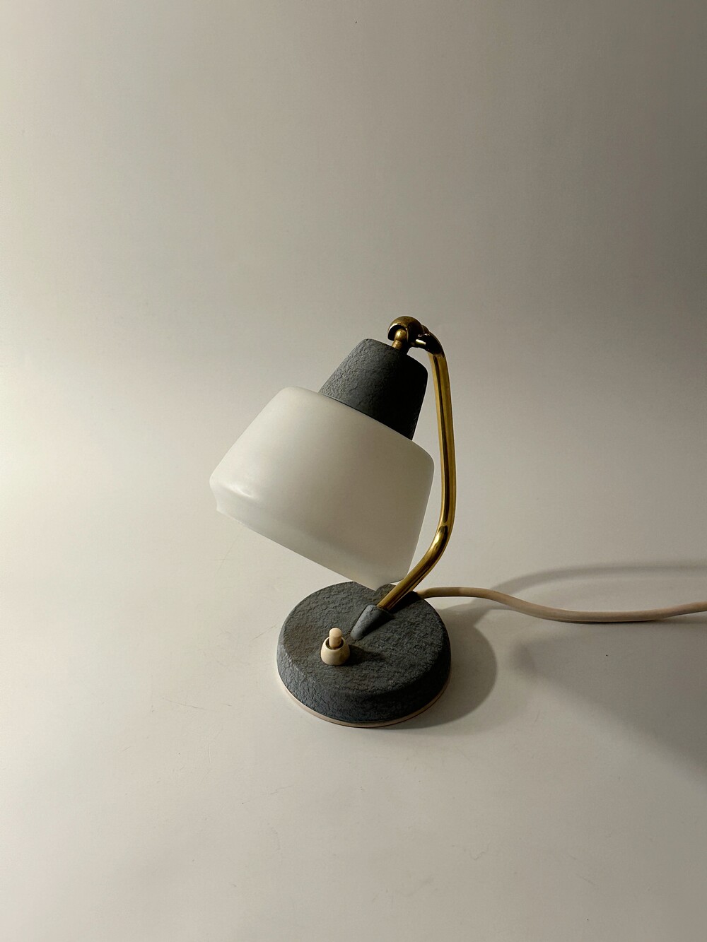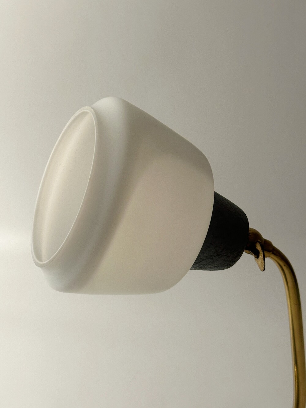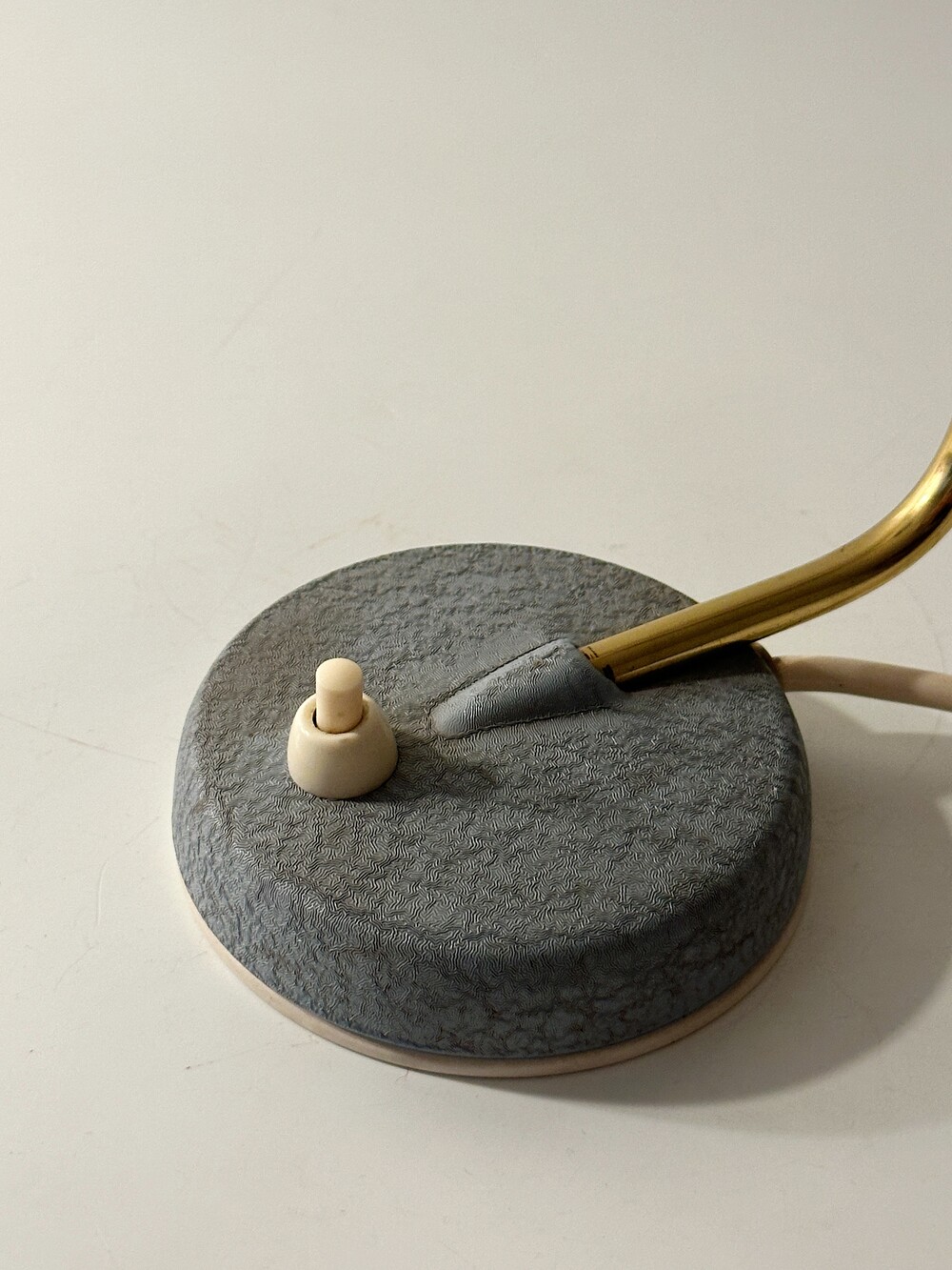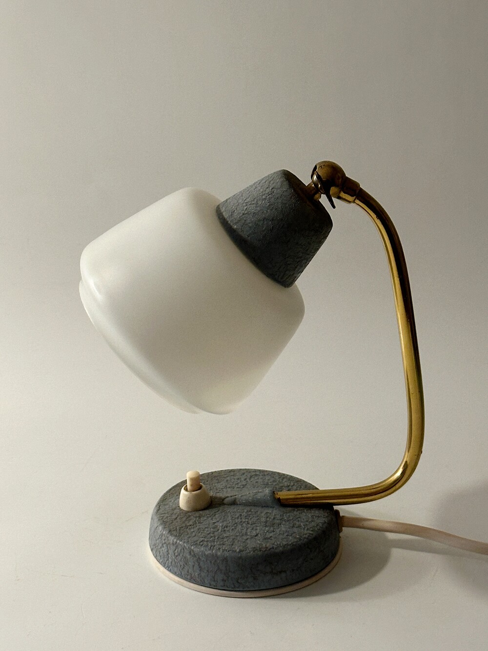 독일에서 넘어온 70년대 빈티지 베드사이드 조명이에요. 불투명한 우유빛 오팔 글래스는 직접적인 빛보단 은은한 빛을 제공해 안락한 분위기를 만들어준답니다. 우아하고 유연한 브라스 곡선 프레임은 고급스럽고 안정적이에요. 헤드 부분 상하 조절이 가능합니다. 마지막으로 베이스와 갓의 소재는 먼지나 기름에 강하고 오래 사용할 수 있도록 텍스처 페인트 마감이 되어 자연스러운 에이징을 느낄 수 있습니다. 컬러감은 다소 레어한 블루 그레이톤에 가깝습니다. ✨