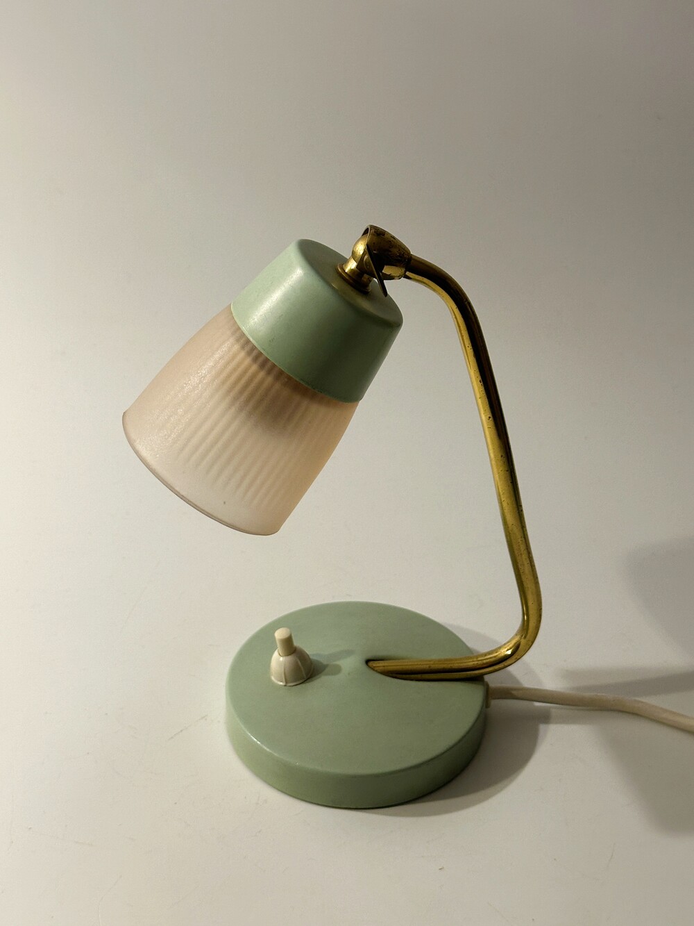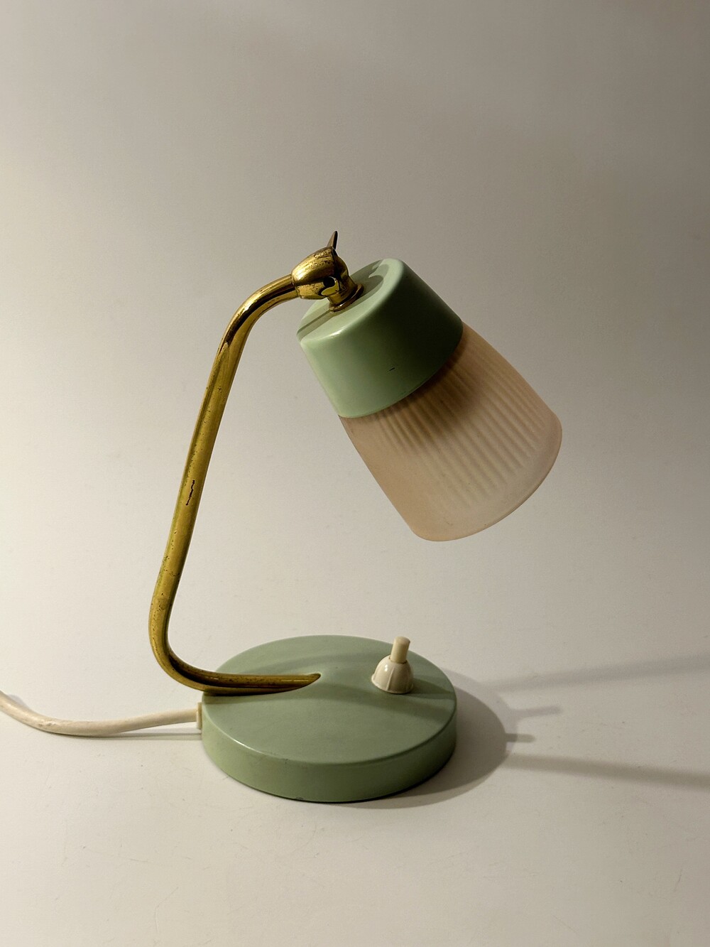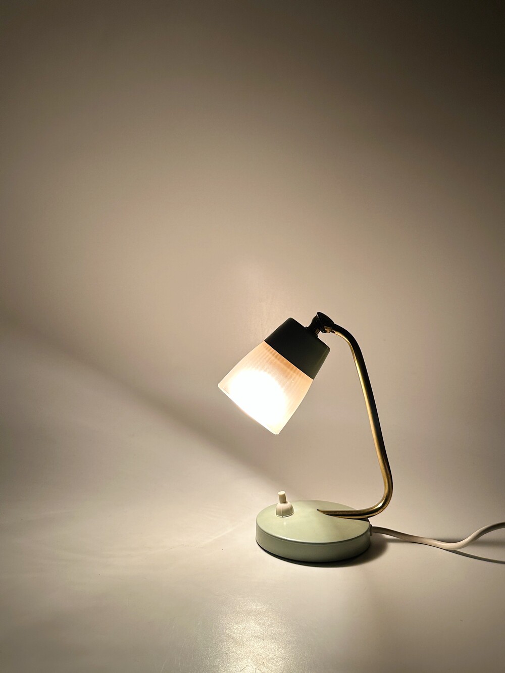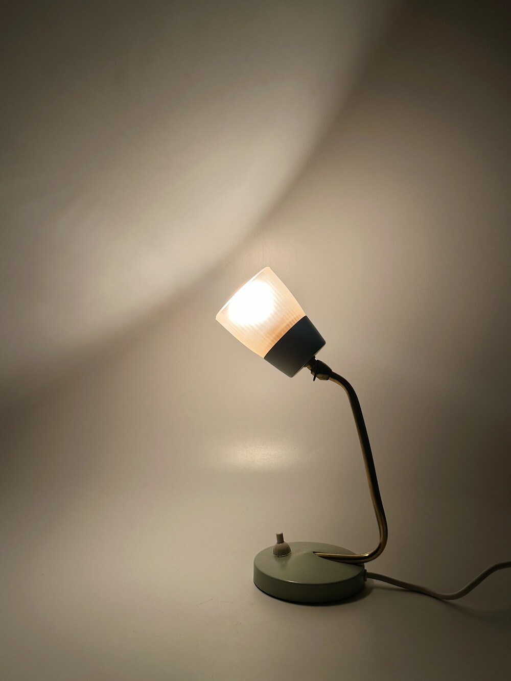 레트로한 민트 컬러의 색감이 인상적인 70년대 독일 빈티지 베드사이드 램프에요. 작고 둥근 불투명 글래스을 통해 은은한 빛을 전해주고, 부드럽게 꺽인 브라스의 넥 부분은 고급스럽고 안정감을 주네요. 작은 섬세한 부분으로, 헤드부분 컨트롤 할 수 있습니다. 과한 빛이 아닌 차분하고 편안한 조도를 느낄 수 있어요. 그래서 아마 옛날 사람들도 침대 옆 협탁, 즉 베드 사이드용으로 사용했을 거에요. ✨🛌