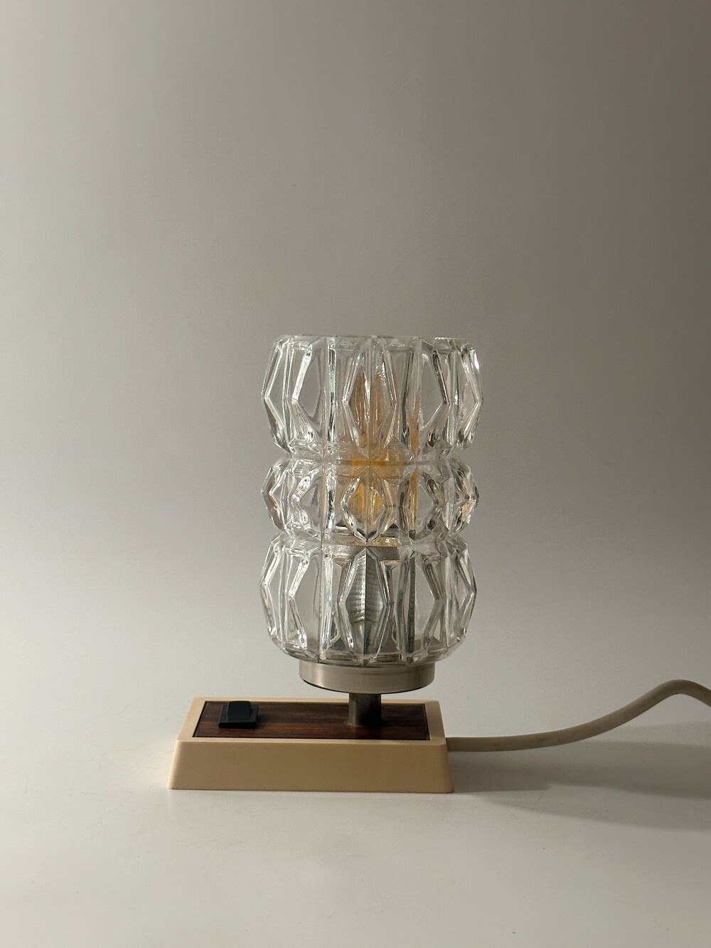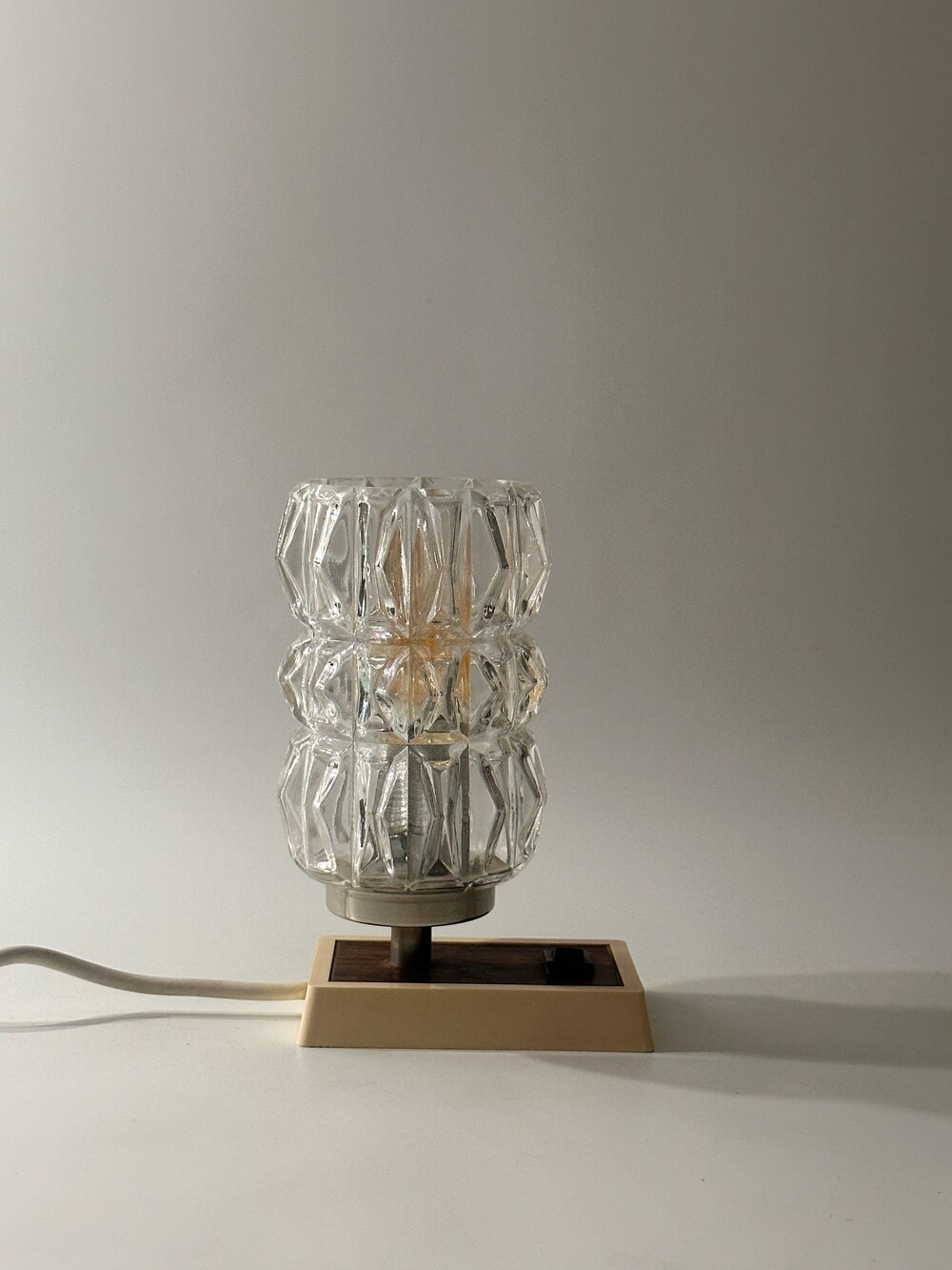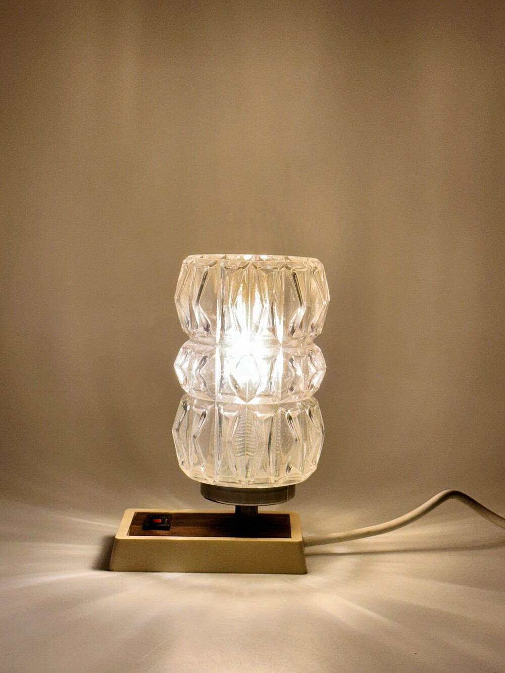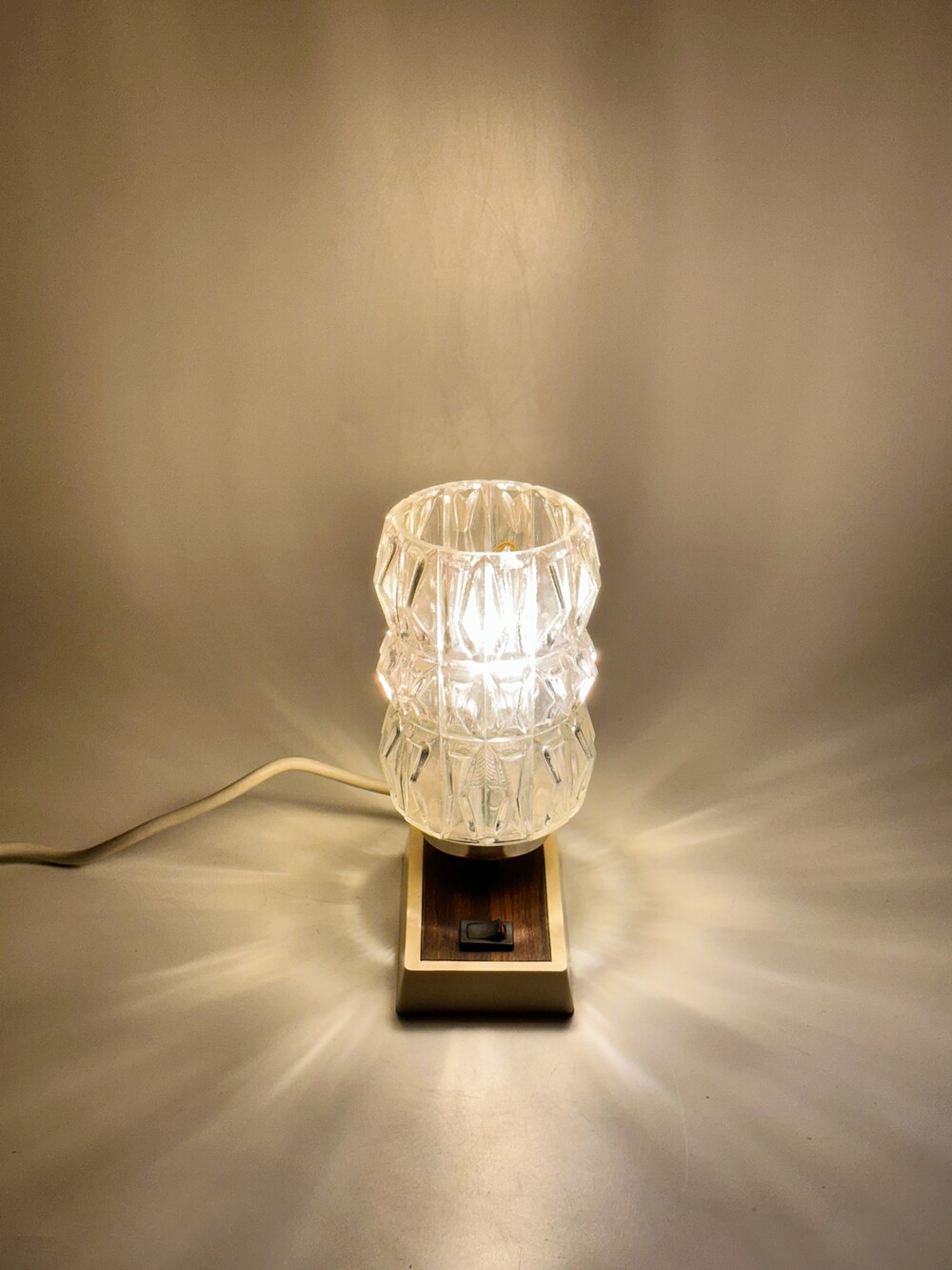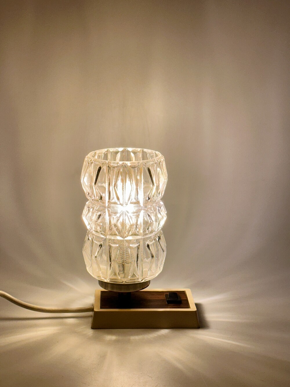 정교하고 유려하게 각진 글래스의 라인이 인상적인 70년대 독일 HUSTADT 빈티지 조명이에요. 다이아 패턴의 텍스처로 구성이 된 글래스라서 전원을 키면 아름다운 빛 번짐이 펼쳐진답니다. 월넛 우드 패널이 매립되어 조금 더 따뜻한 느낌을 느낄 수 있습니다. 전원 버튼도 똑딱, 플라스틱 버튼과 레드 포인트 디테일이 귀엽습니다. 침대 옆 협탁에 두어 포근한 빛과 하루를 마감하시면 어떨까요!? ✨