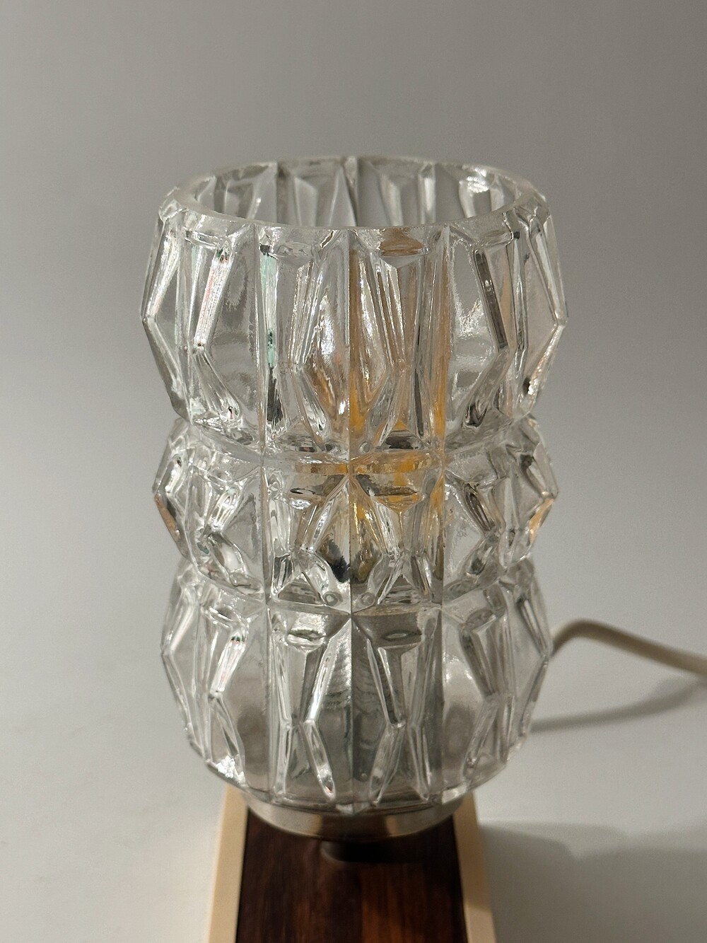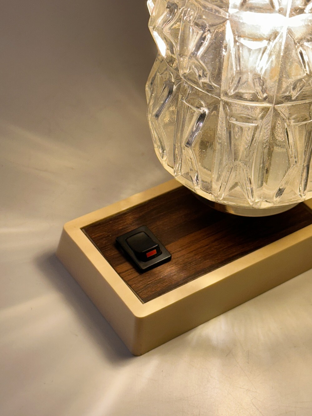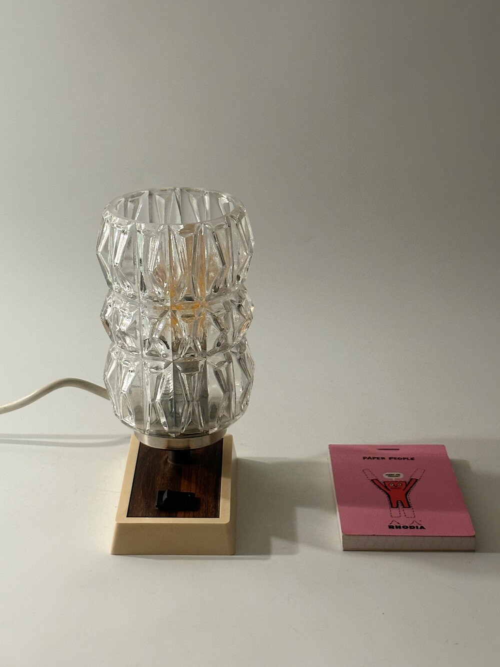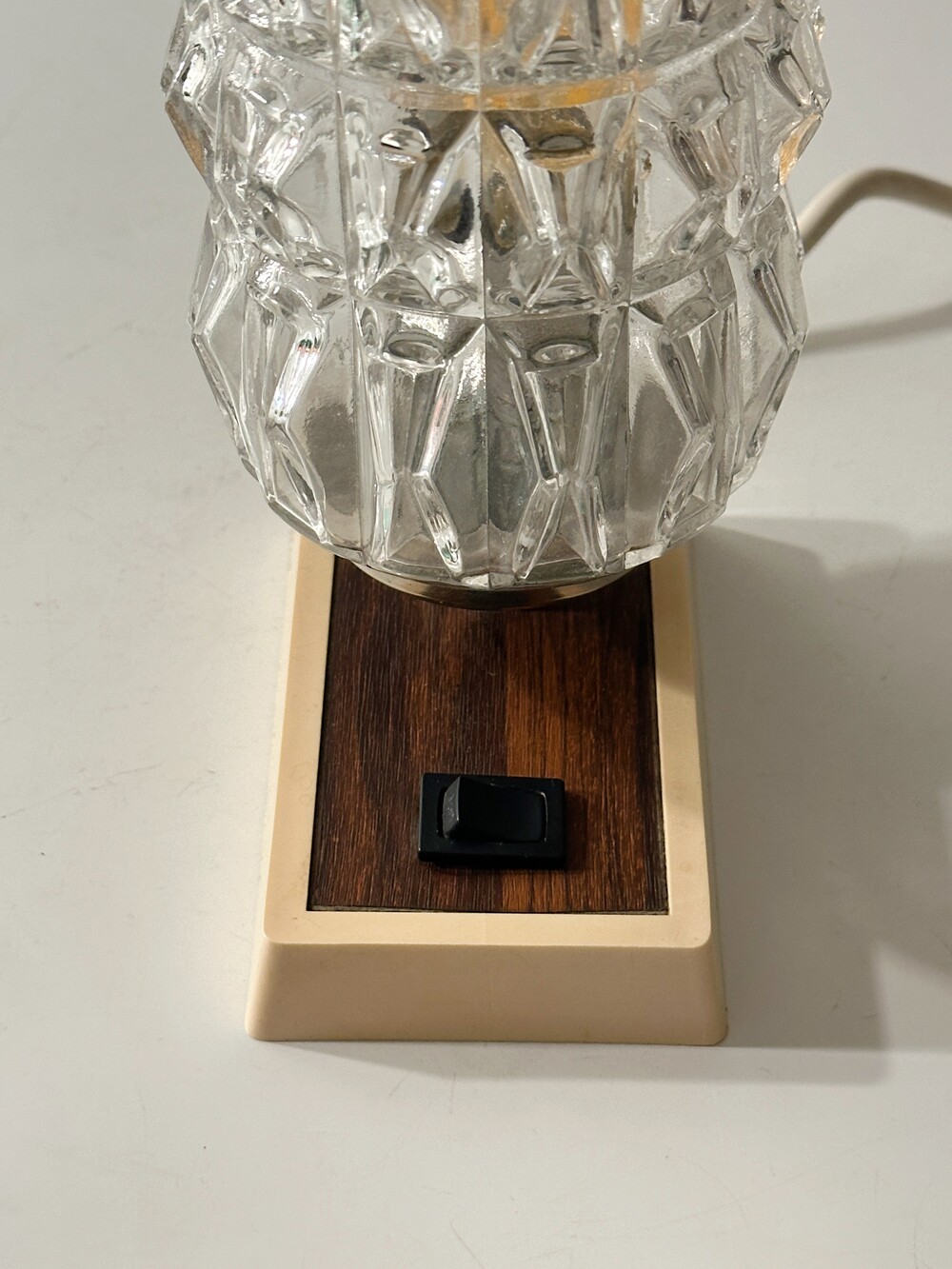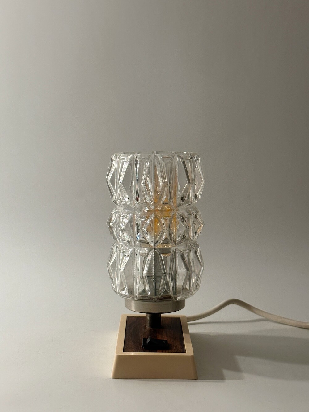 정교하고 유려하게 각진 글래스의 라인이 인상적인 70년대 독일 HUSTADT 빈티지 조명이에요. 다이아 패턴의 텍스처로 구성이 된 글래스라서 전원을 키면 아름다운 빛 번짐이 펼쳐진답니다. 월넛 우드 패널이 매립되어 조금 더 따뜻한 느낌을 느낄 수 있습니다. 전원 버튼도 똑딱, 플라스틱 버튼과 레드 포인트 디테일이 귀엽습니다. 침대 옆 협탁에 두어 포근한 빛과 하루를 마감하시면 어떨까요!? ✨