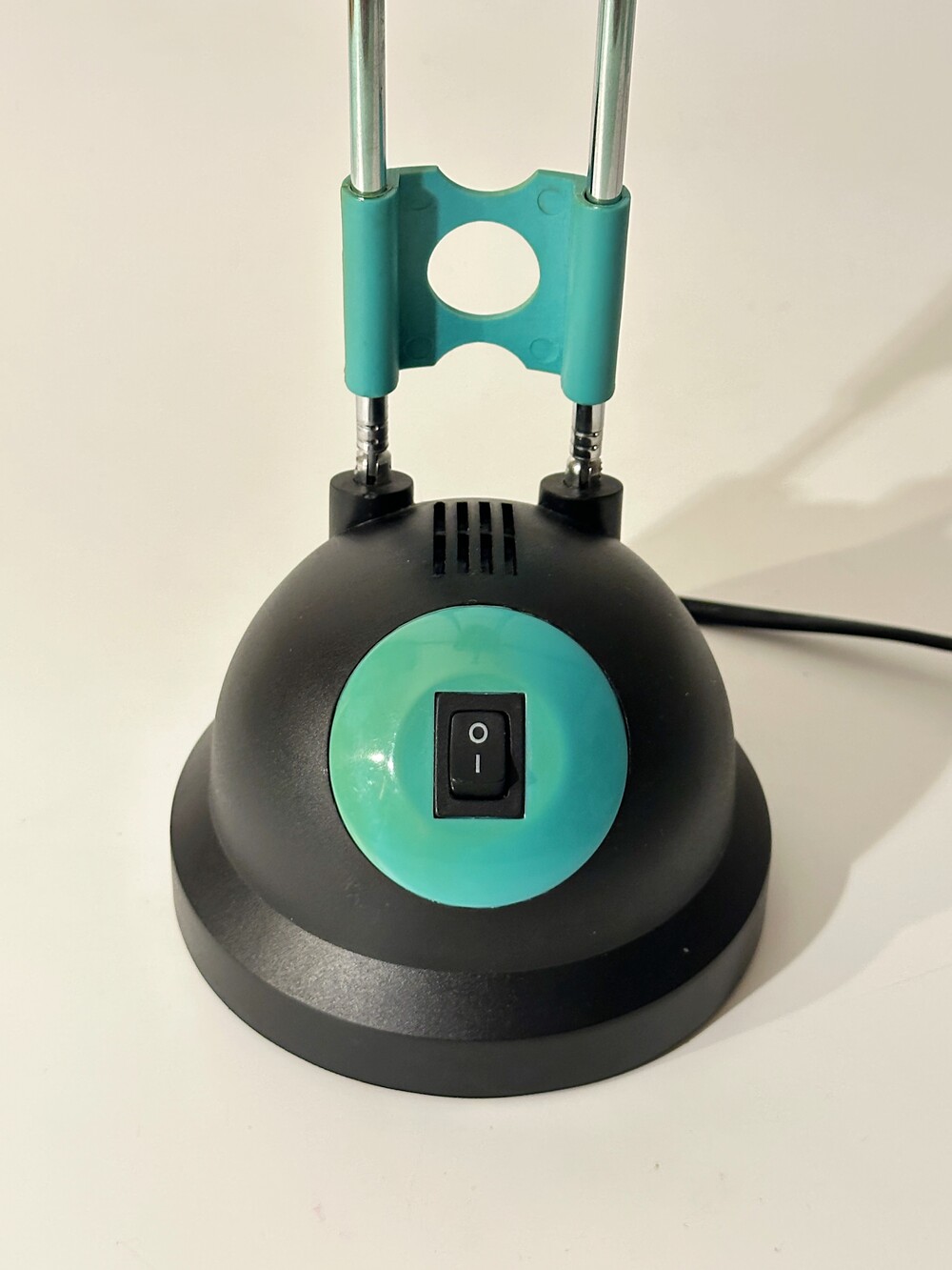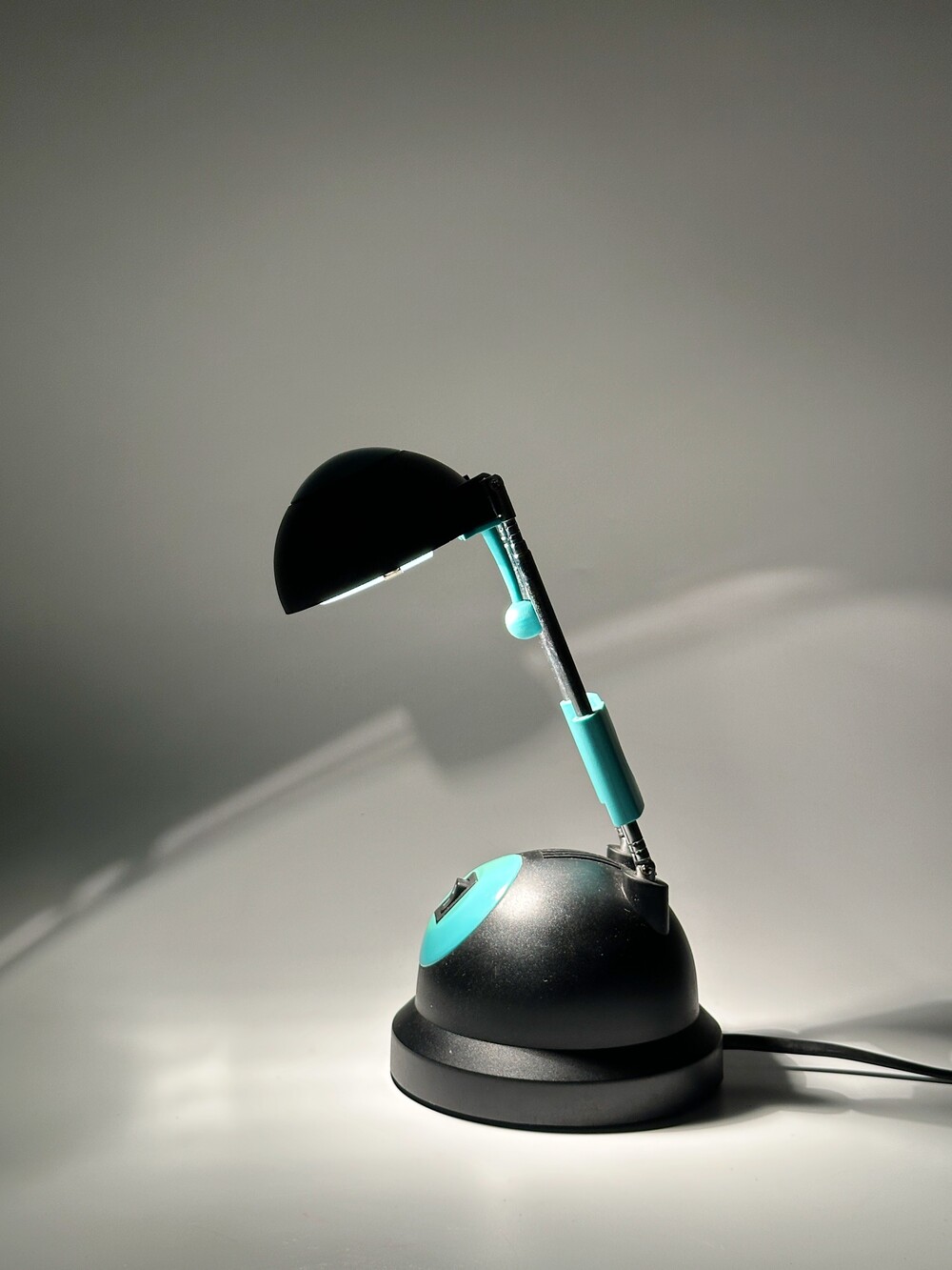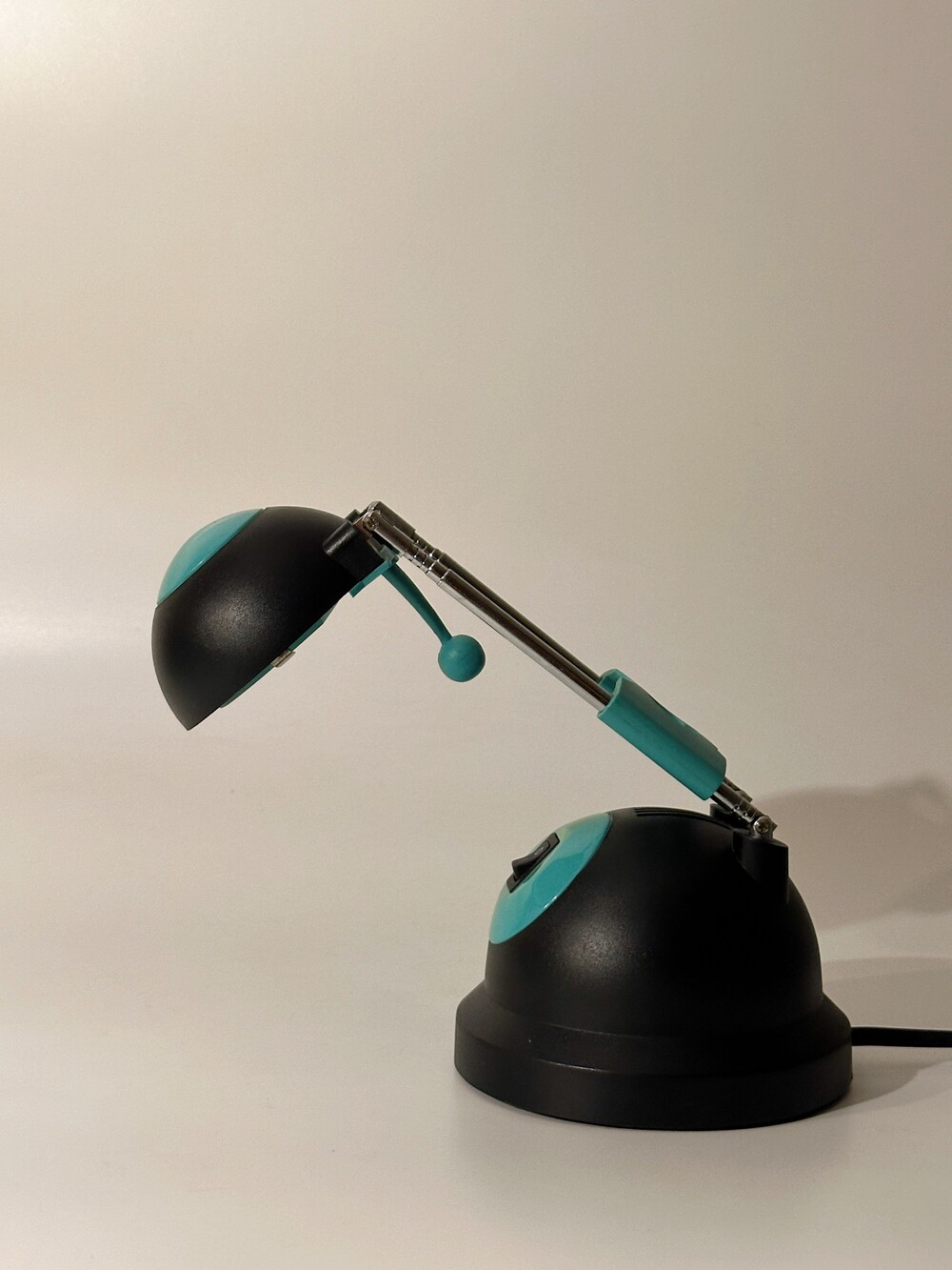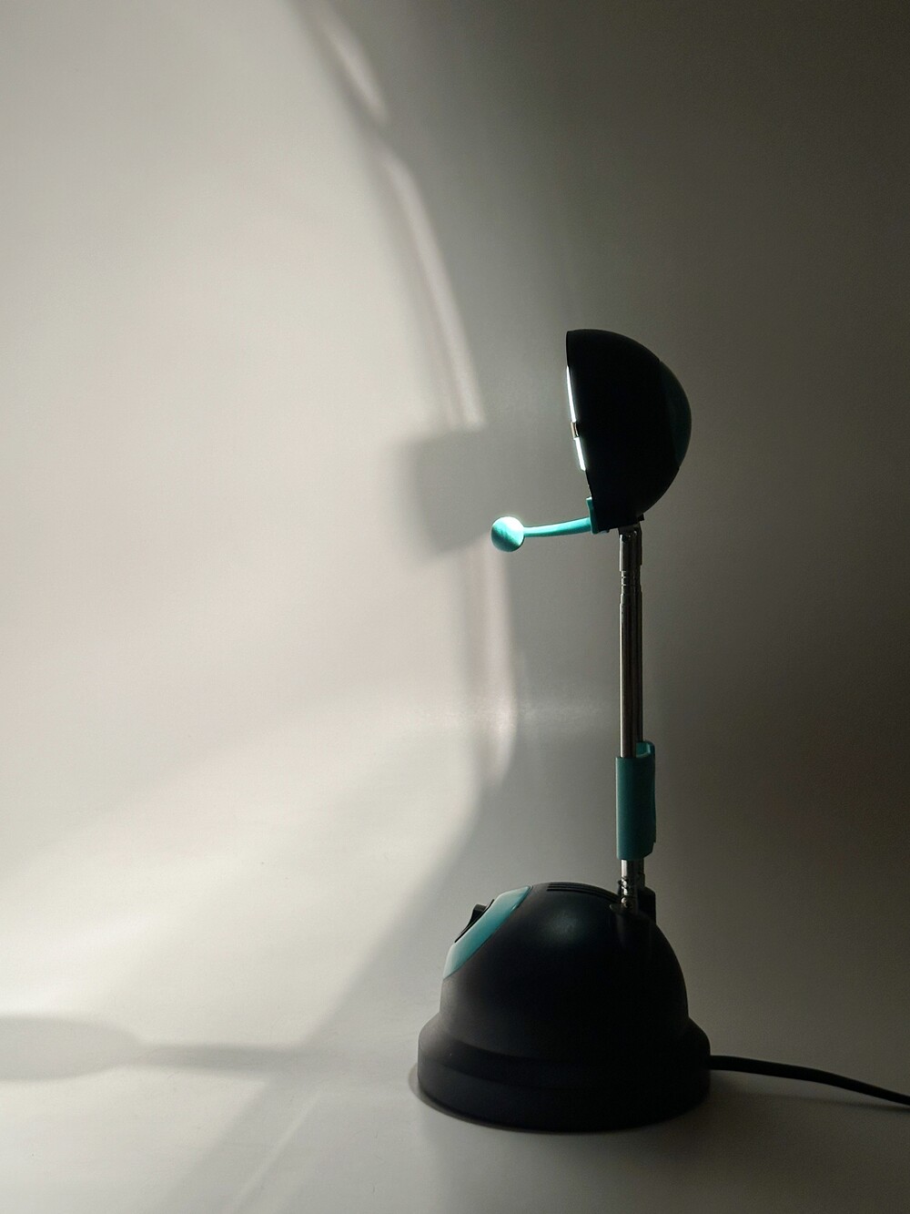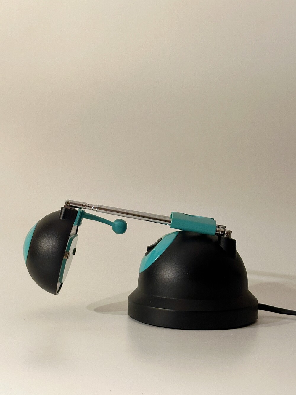 빈티지 테이블 텔레스코픽 조명이에요. 아이의 방이나, 디자이너 작업실에서 사용했을 것 같아요. 전체적으로 몽글몽글 둥근 형태가 귀엽고, 넥 부분은 3단으로 높이 조절이 가능한 텔레스코픽 형태로 되어있습니다. 블랙과 틸(Teal)색에 가까운 컬러로 보기 드문 조합이라 신선하고 모던하면서 깔끈하답니다 🖤