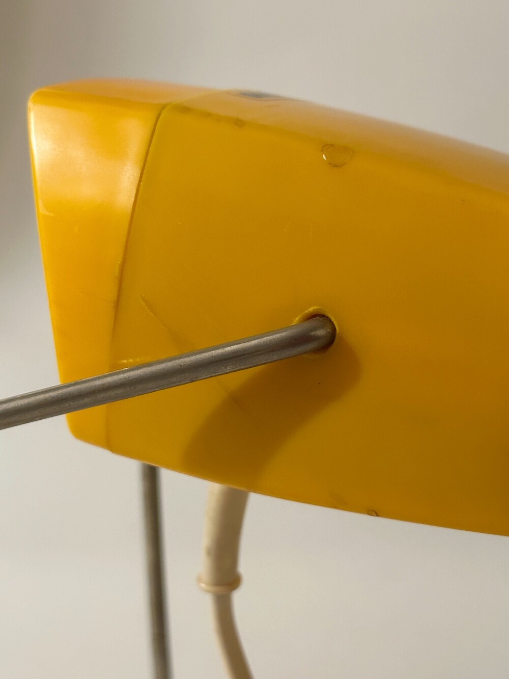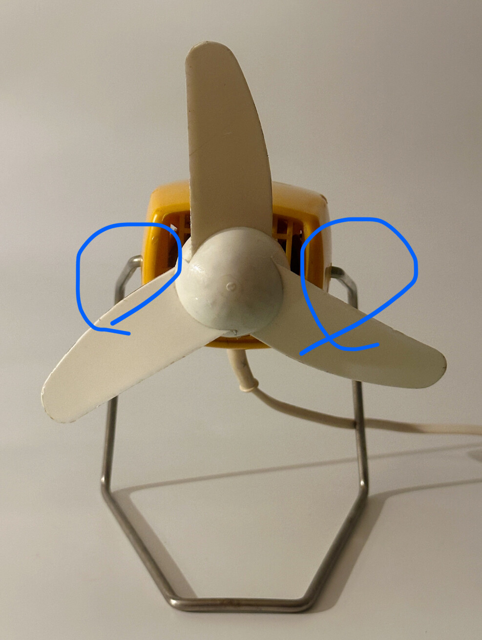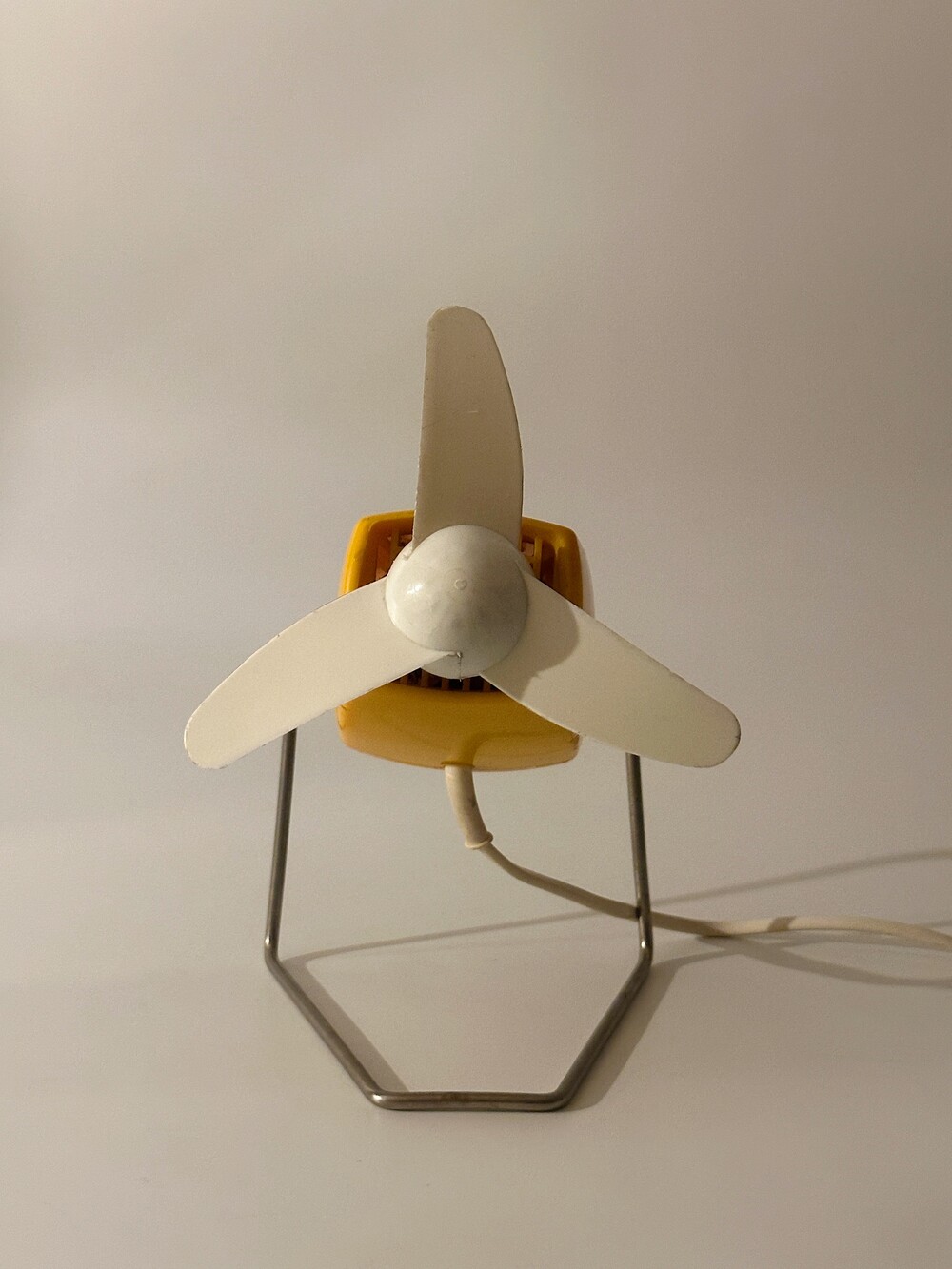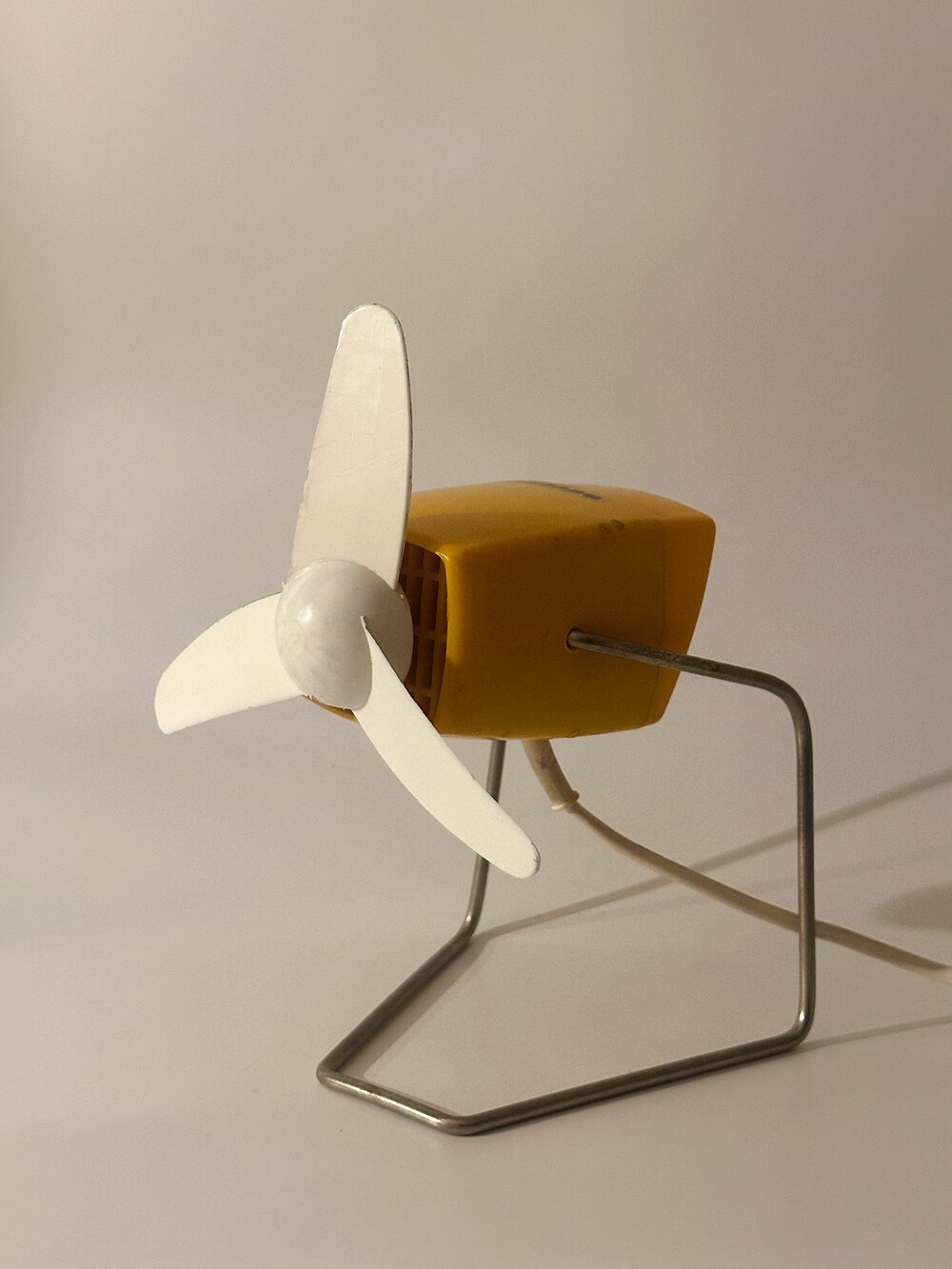 80년대 SEVERIN 사에서 독일에서 만들어진 빈티지 데스크 팬입니다. 머스타디한 옐로우 바디의 화이트 색상 3개의 날개로 구성된 탁상용 선풍기입니다.날개는 고무의 재질이라 회전 중에도 신체가 닿아도 상처가 나지 않고 안전하답니다.