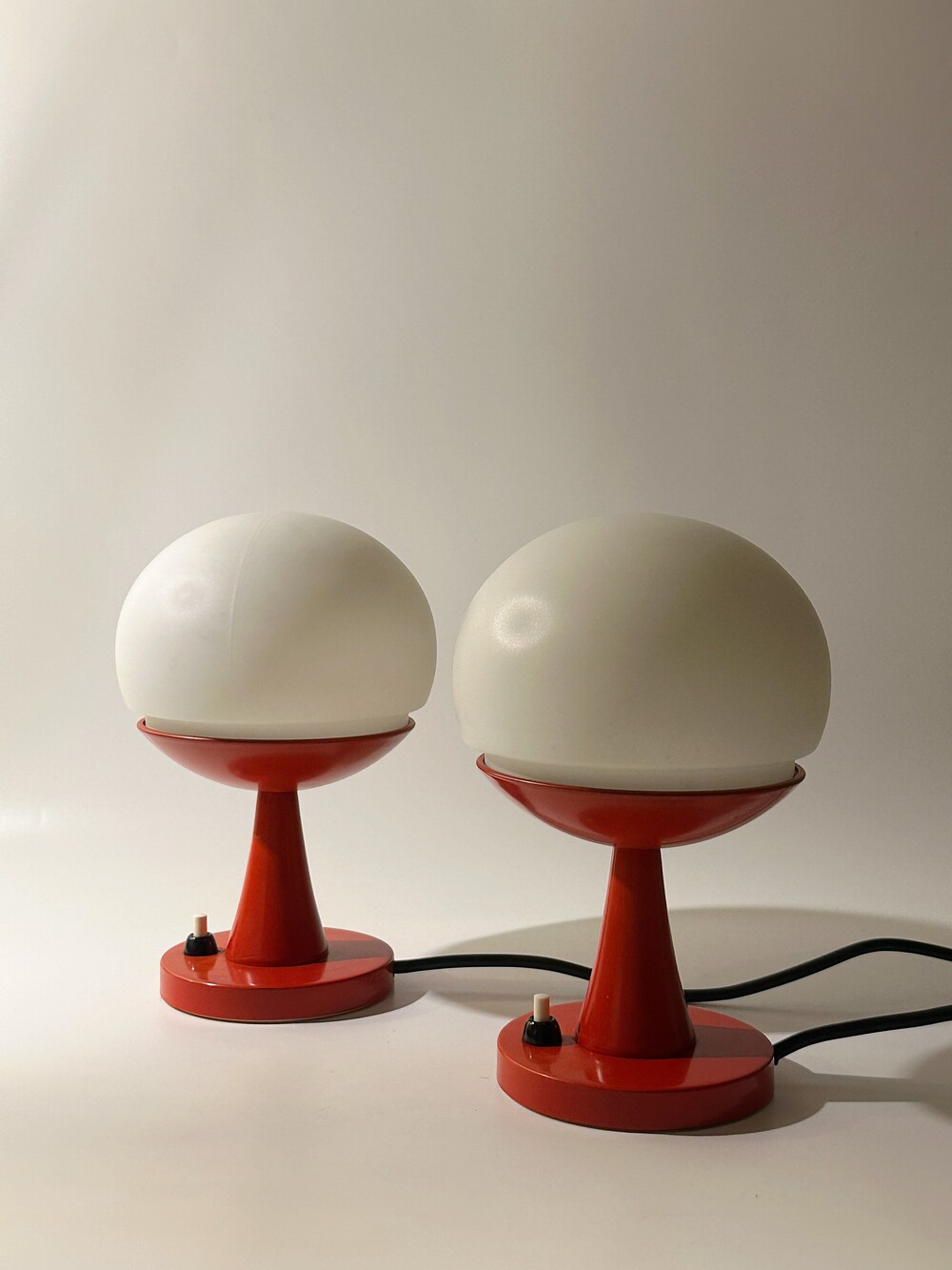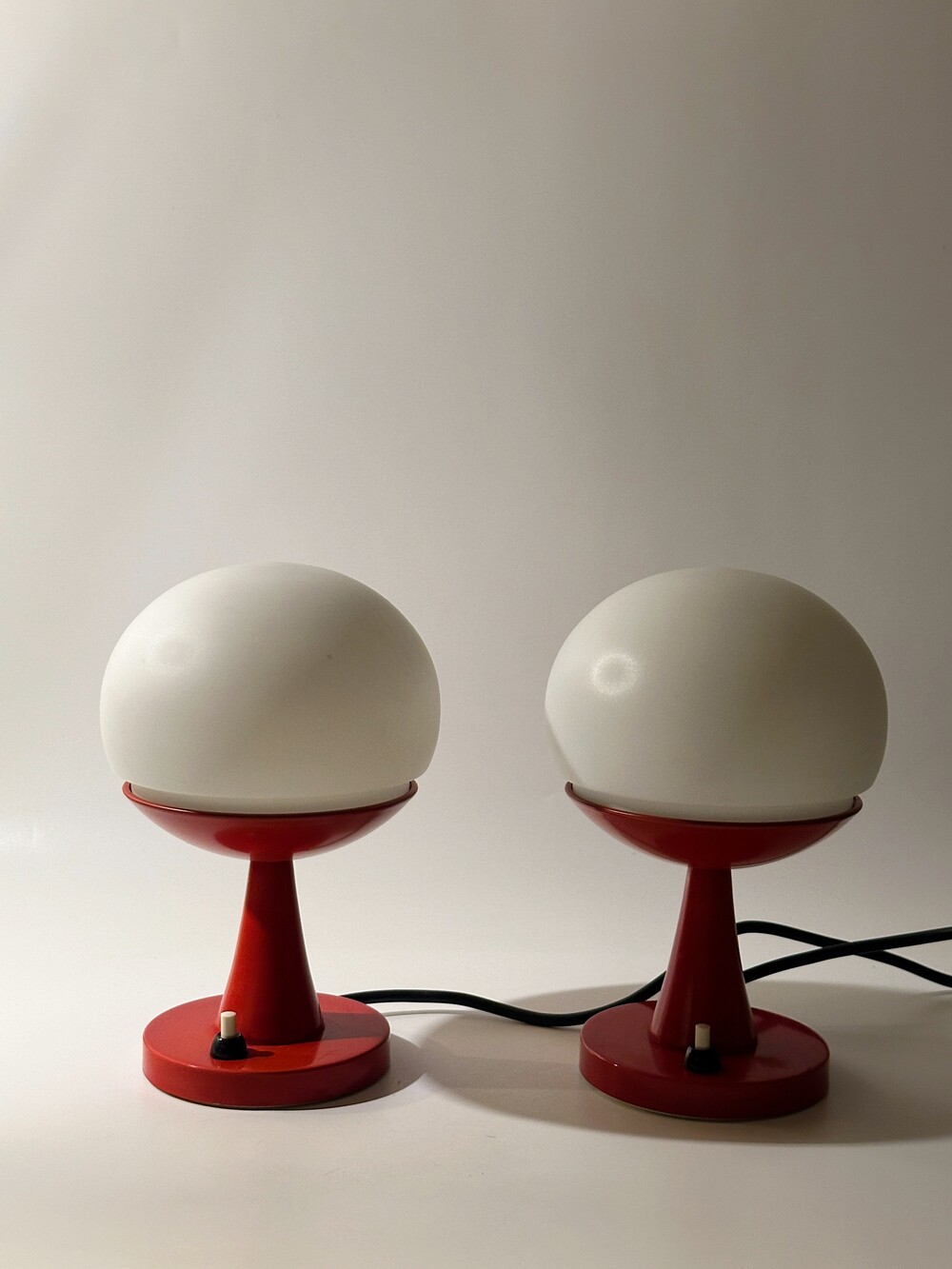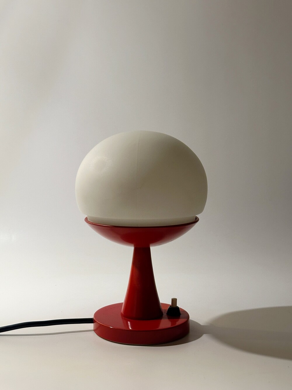 새하얀 글라스 볼과 강렬한 레드 컬러의 스틸로 된 베이스가 인상적인 빈티지 조명이에요. 70년대 우주탐사의 영향으로 우주 시대 디자인을 그대로 옮겨놓은 듯한 스페이스 에이지 형태의 아이코닉한 느낌을 주어요. 주변 공간을 아늑하고 은은하게 퍼지는 따뜻한 무드라 침대 옆 협탁에 수면등으로도 추천드려요. 또한 보기 드물게 동일 모델로 커플로 있기 때문에 사이 좋게 양쪽에 하나씩 커플용으로도 추천! ❤️❤️